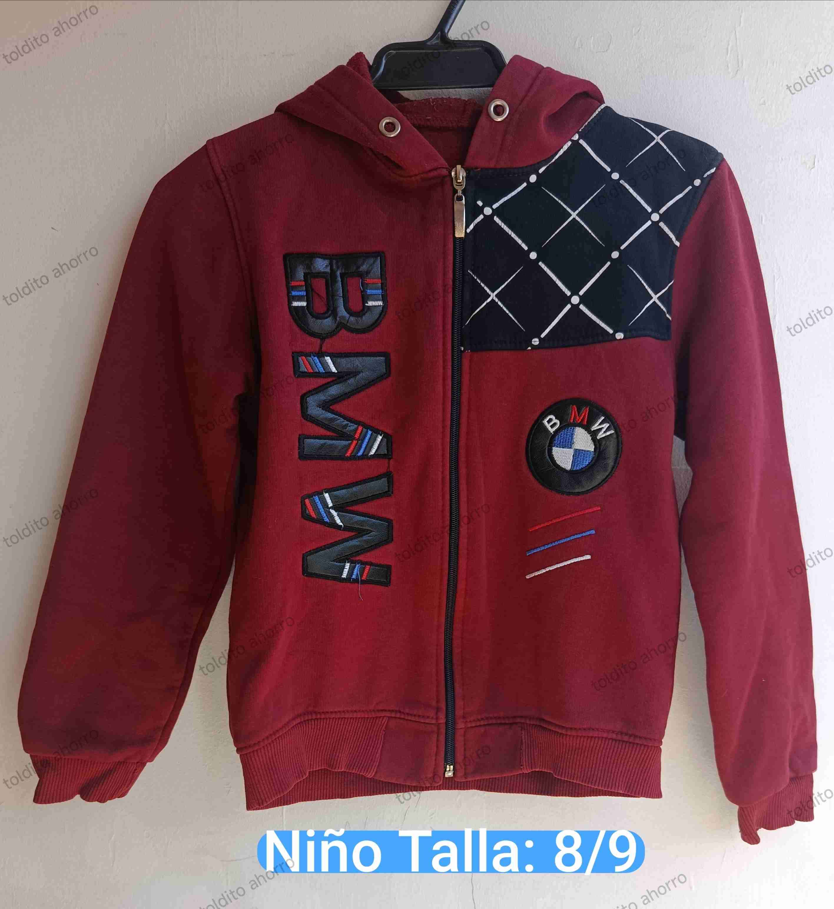 Polerón de niño rojo con diseño de BMW, ideal para abrigar en días fríos. En buen estado, talla 8/9.