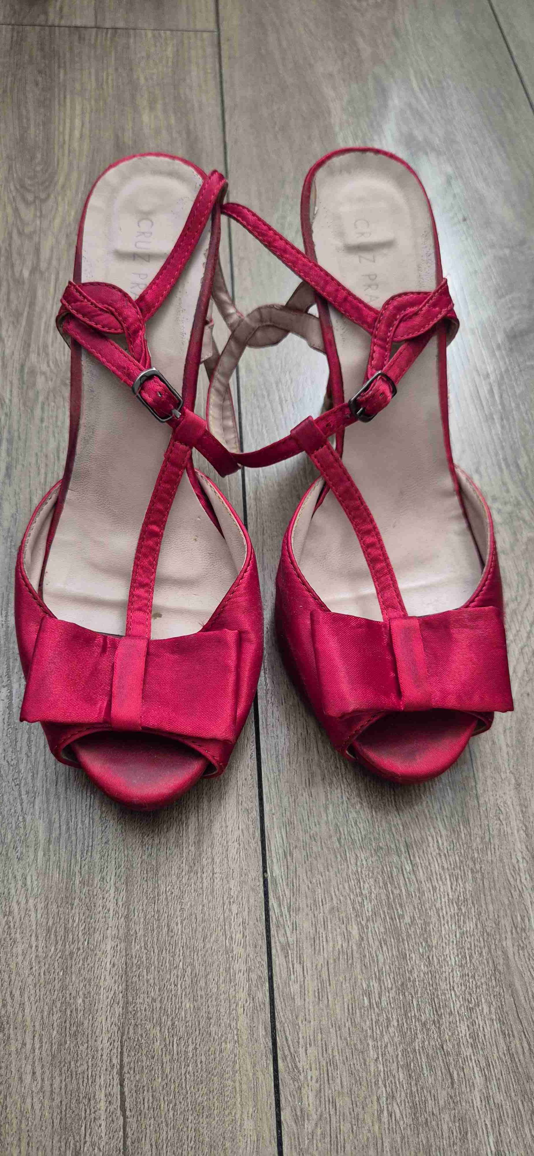 Elegantes sandalias rojas con lazo, perfectas para ocasiones especiales. Buen estado general.