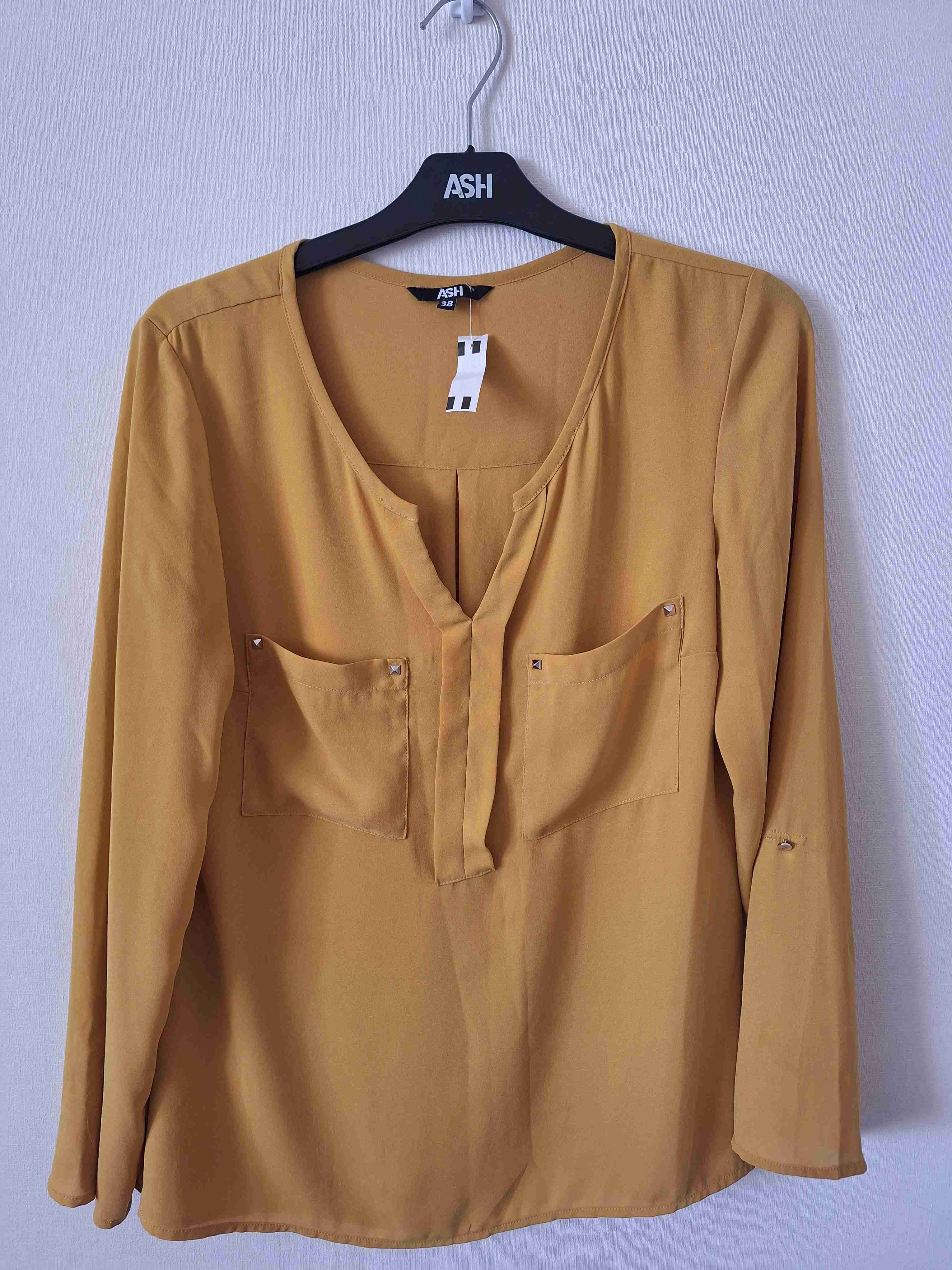 Blusa de mujer color mostaza con bolsillos frontales. En buen estado, ideal para uso casual.