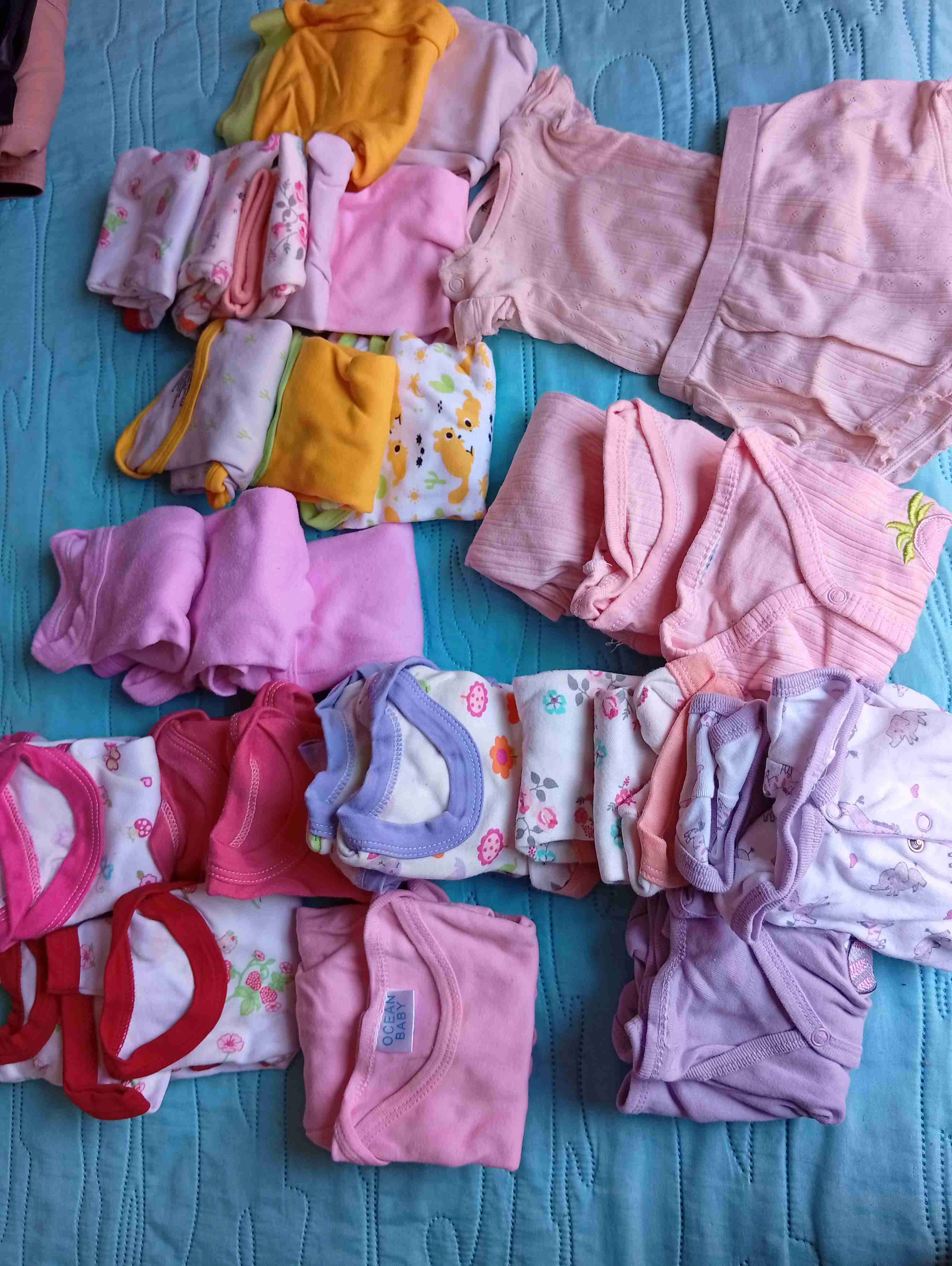 Conjunto de ropa colorida para bebé en buen estado, ideal para diferentes ocasiones. Incluye bodys y pijamas de algodón.