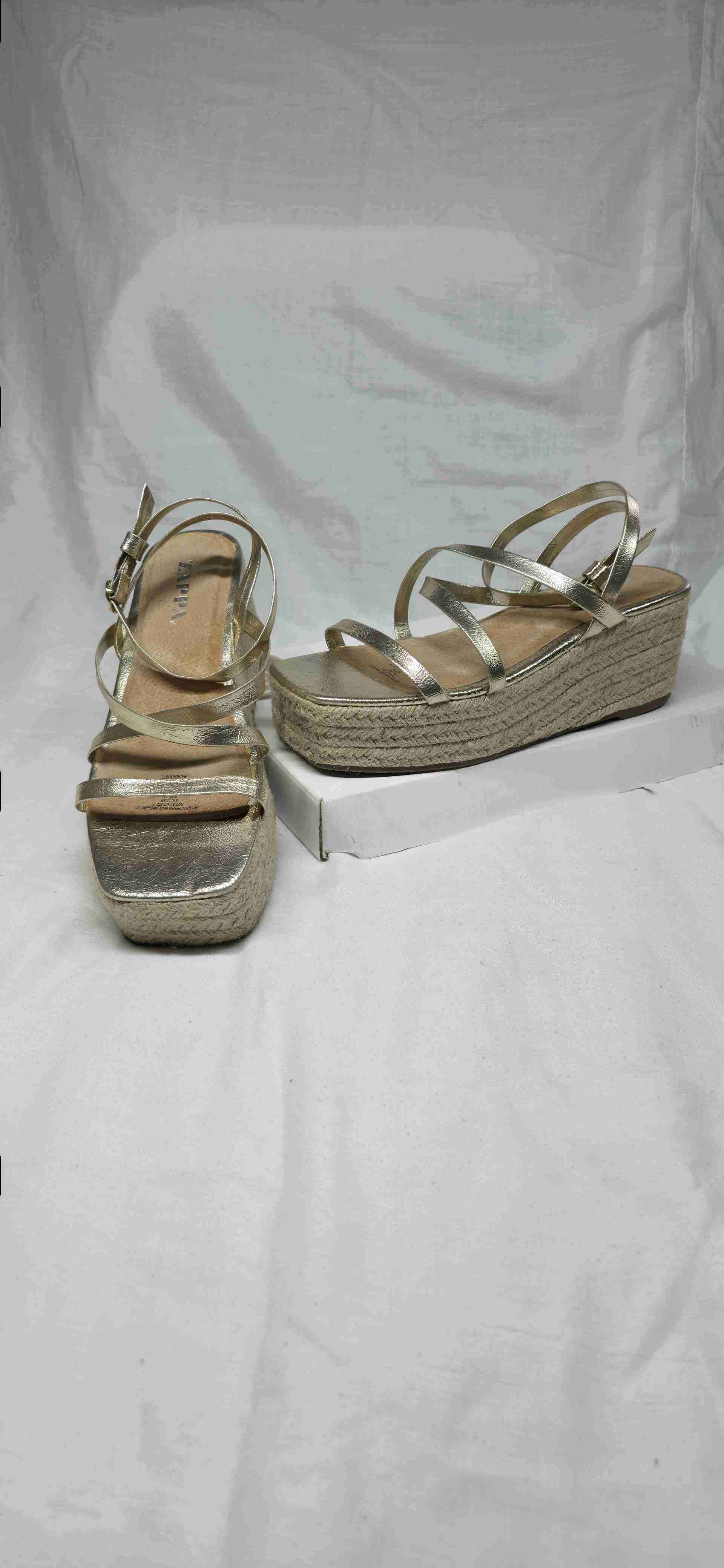 Elegantes sandalias de plataforma con tiras doradas, ideales para ocasiones especiales. Muy buen estado.