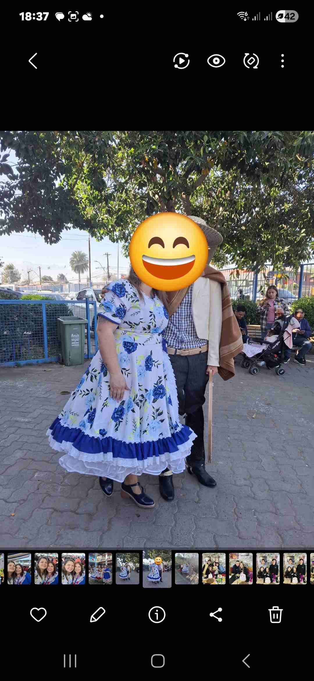 Hermoso vestido típico chileno con diseño floral en tonos azules. Ideal para fiestas y eventos costumbristas. En buen estado con detalles cuidados, corset en espalda.