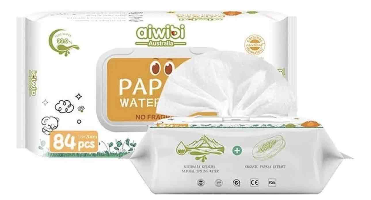 Toallas húmedas Aiwibi papaya, ideales para el cuidado diario del bebé. Presentación en 3 paquetes de 84 unidades.