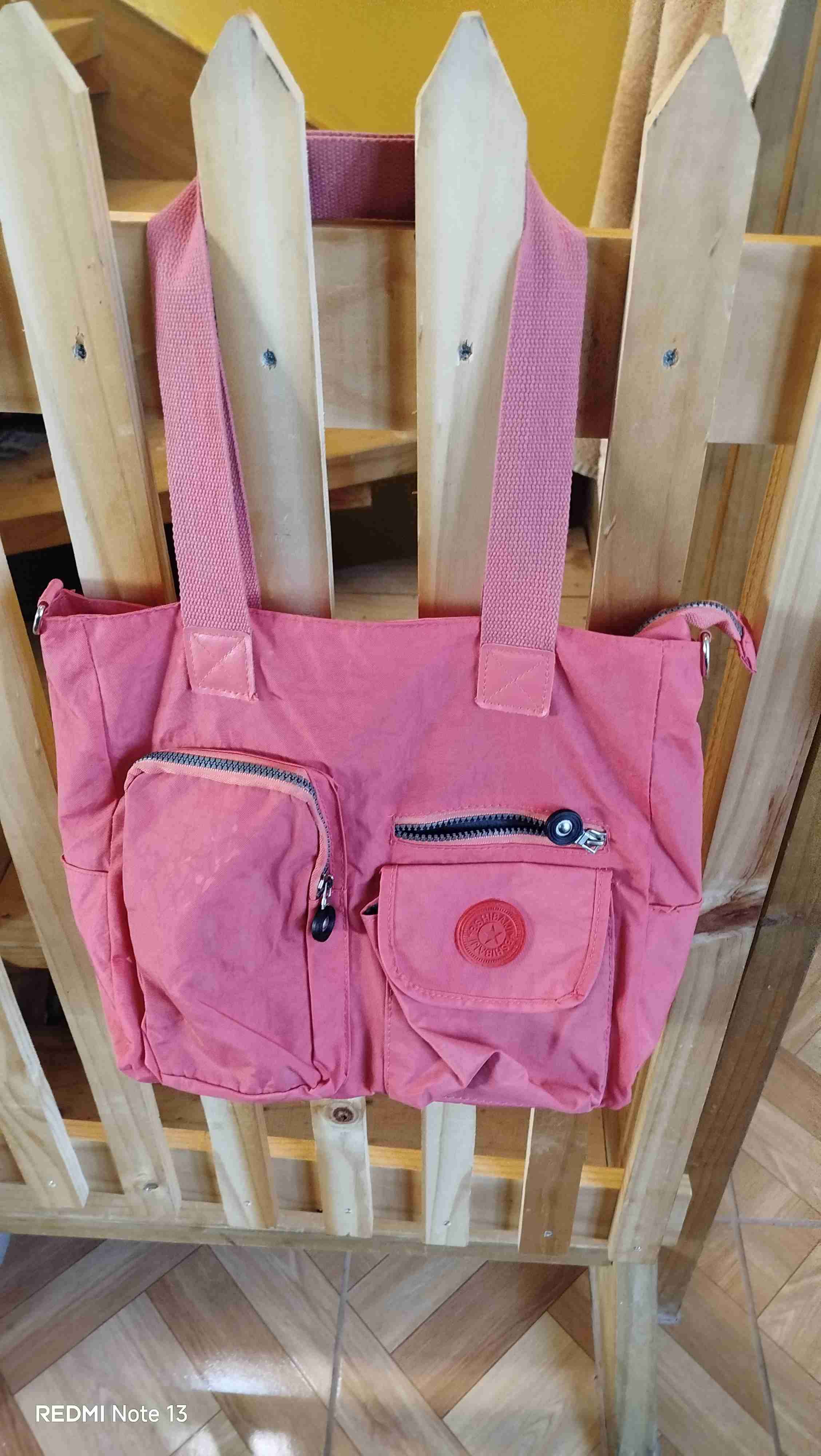Bolso rosado de tela resistente, con múltiples bolsillos y fácil de llevar. Ideal para uso diario.