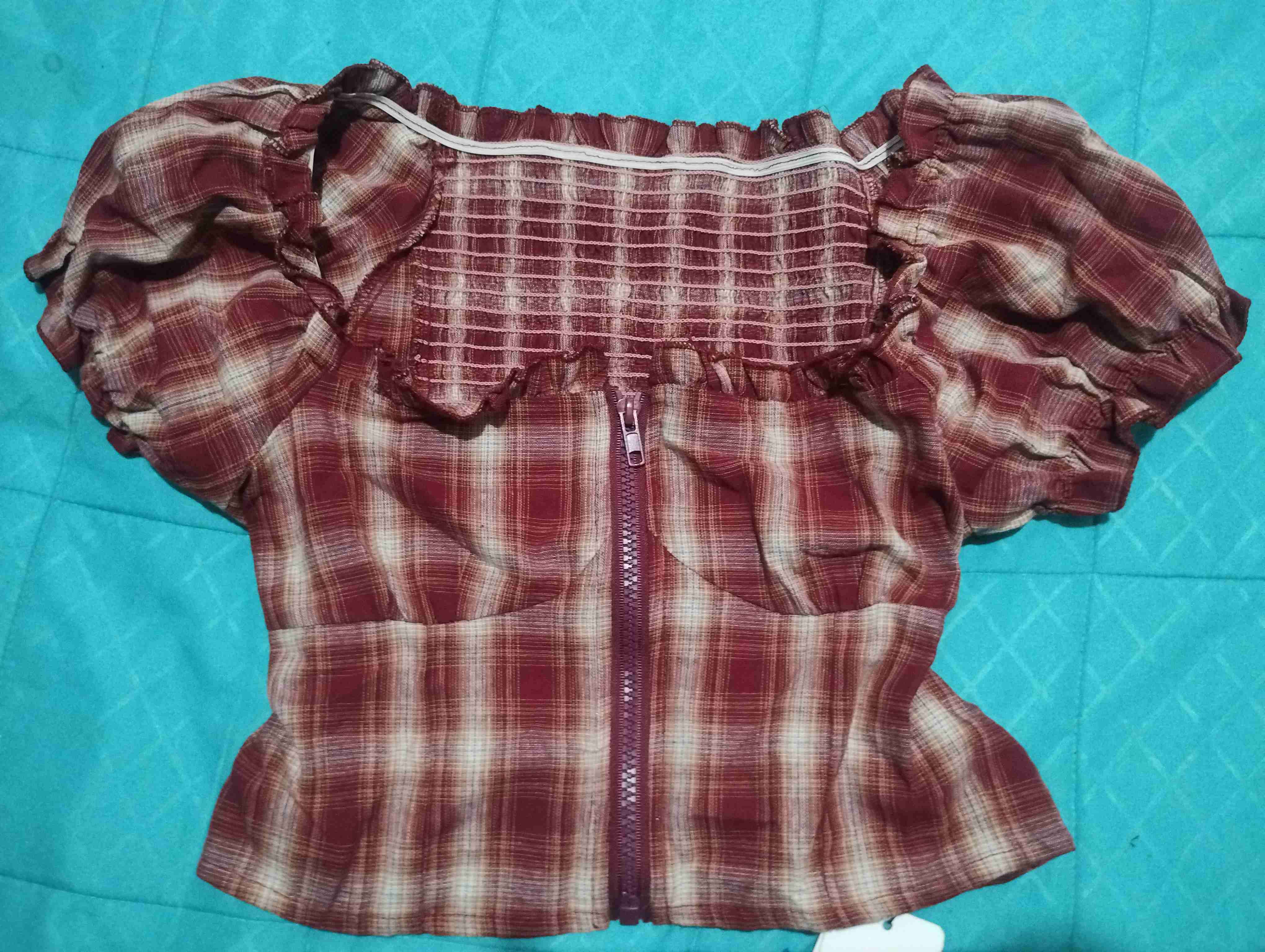 Top de tela a cuadros, color rojo con cremallera frontal y mangas abullonadas. Completamente nueva, sin usar, sin detalles. Talla S-M, se ajusta.