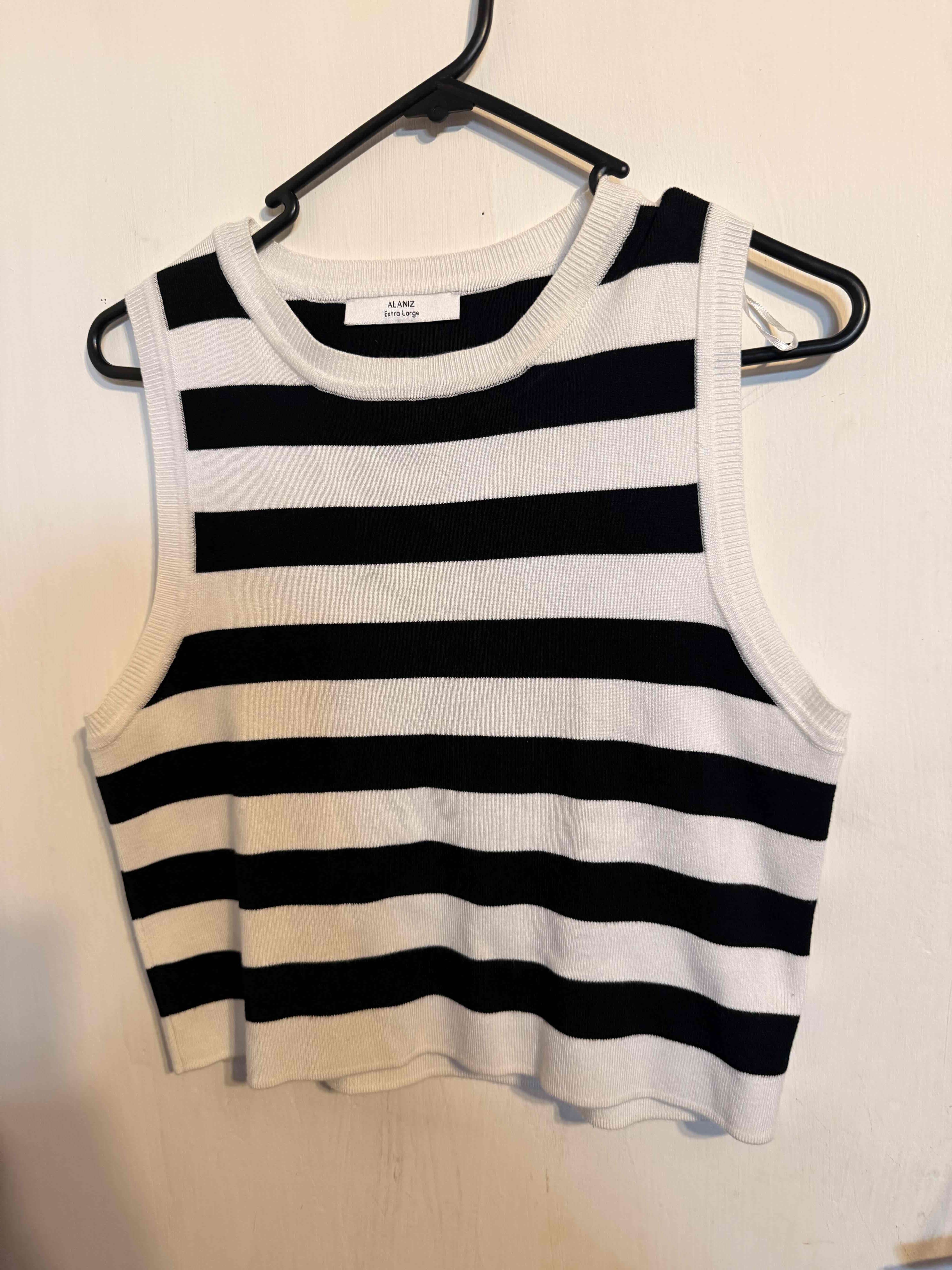 Top de hilo sin mangas a rayas blanco y negro, ideal para combinar con jeans o faldas. Marca Alaniz. Cómodo. Temporada otoño invierno