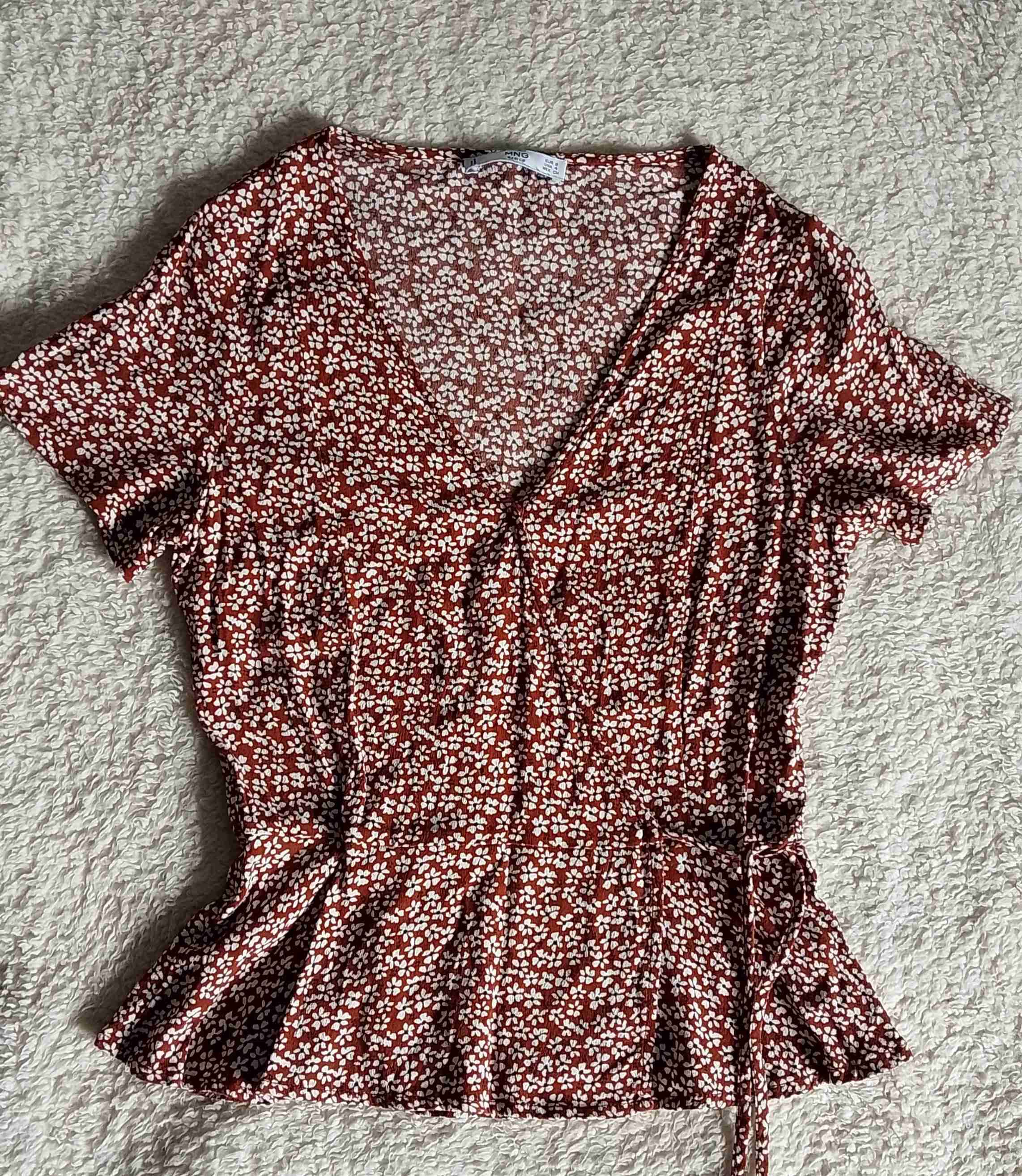 Blusa con diseño floral, en buen estado, ideal para días casuales. Tela fresca y cómoda. Naranjo rojizo