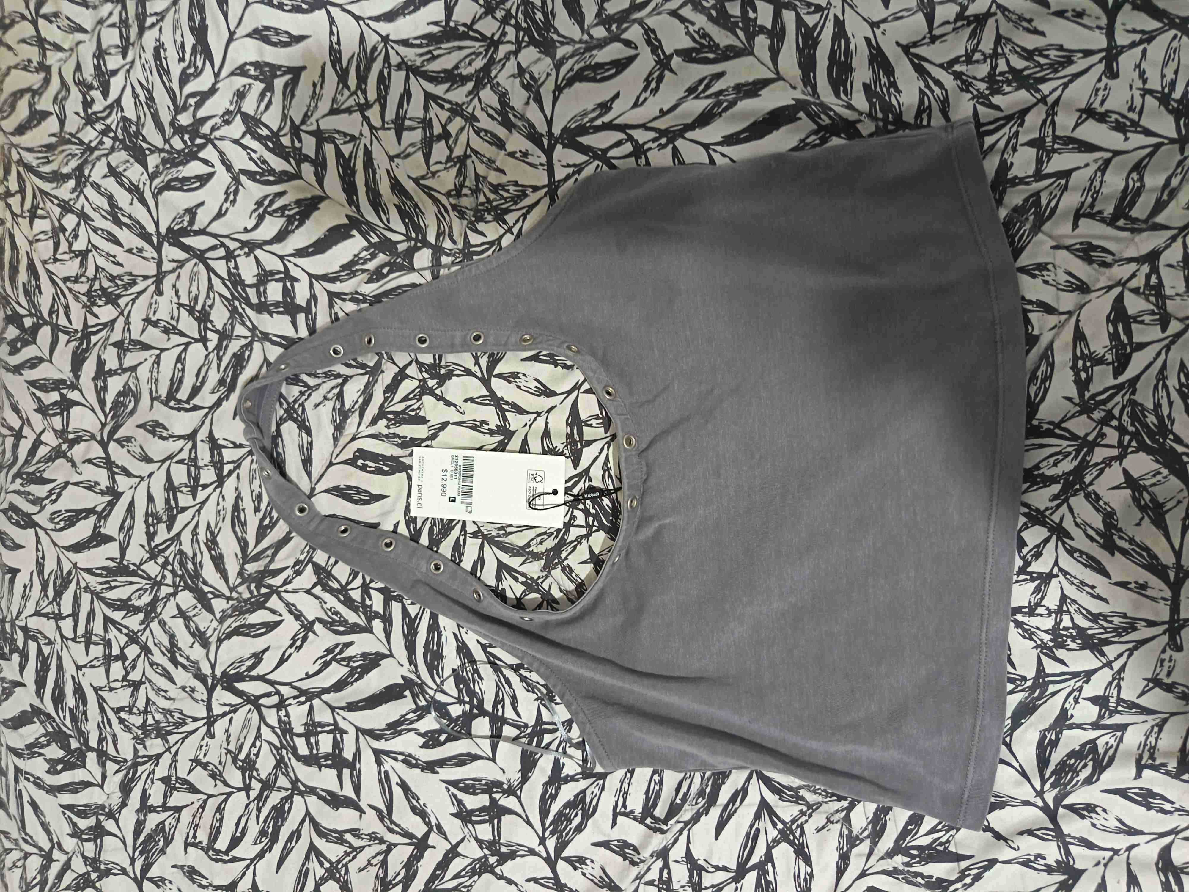 Top gris estilo con aros decorativos en el escote. Ideal para usar en el para un look casual. Está nuevo con etiqueta. Talla L (Pequeña) Contacto: +569 91932324