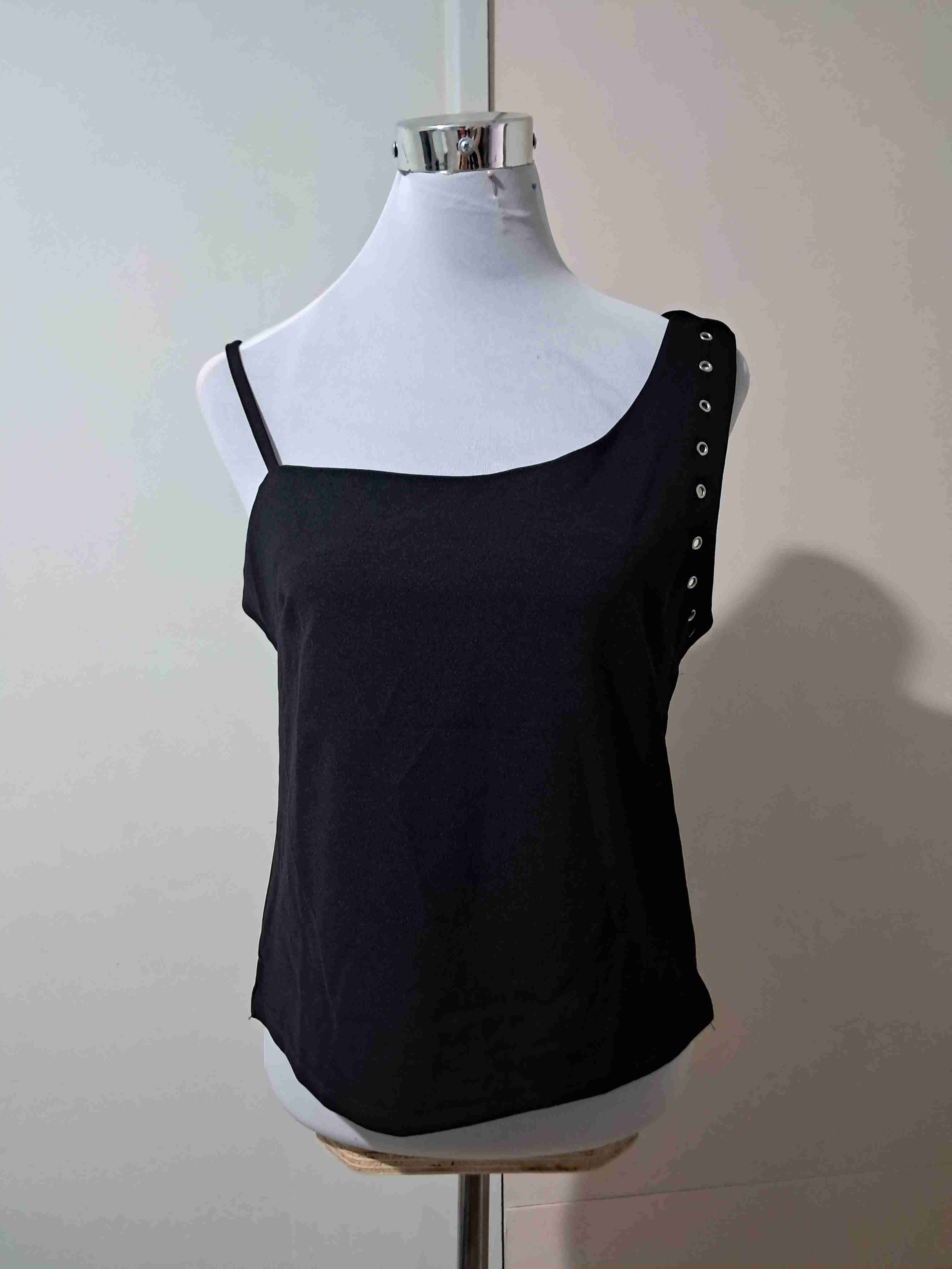 Elegante top negro semi elasticado, ideal para salidas nocturnas. Nuevo, con detalles de botones en el hombro.