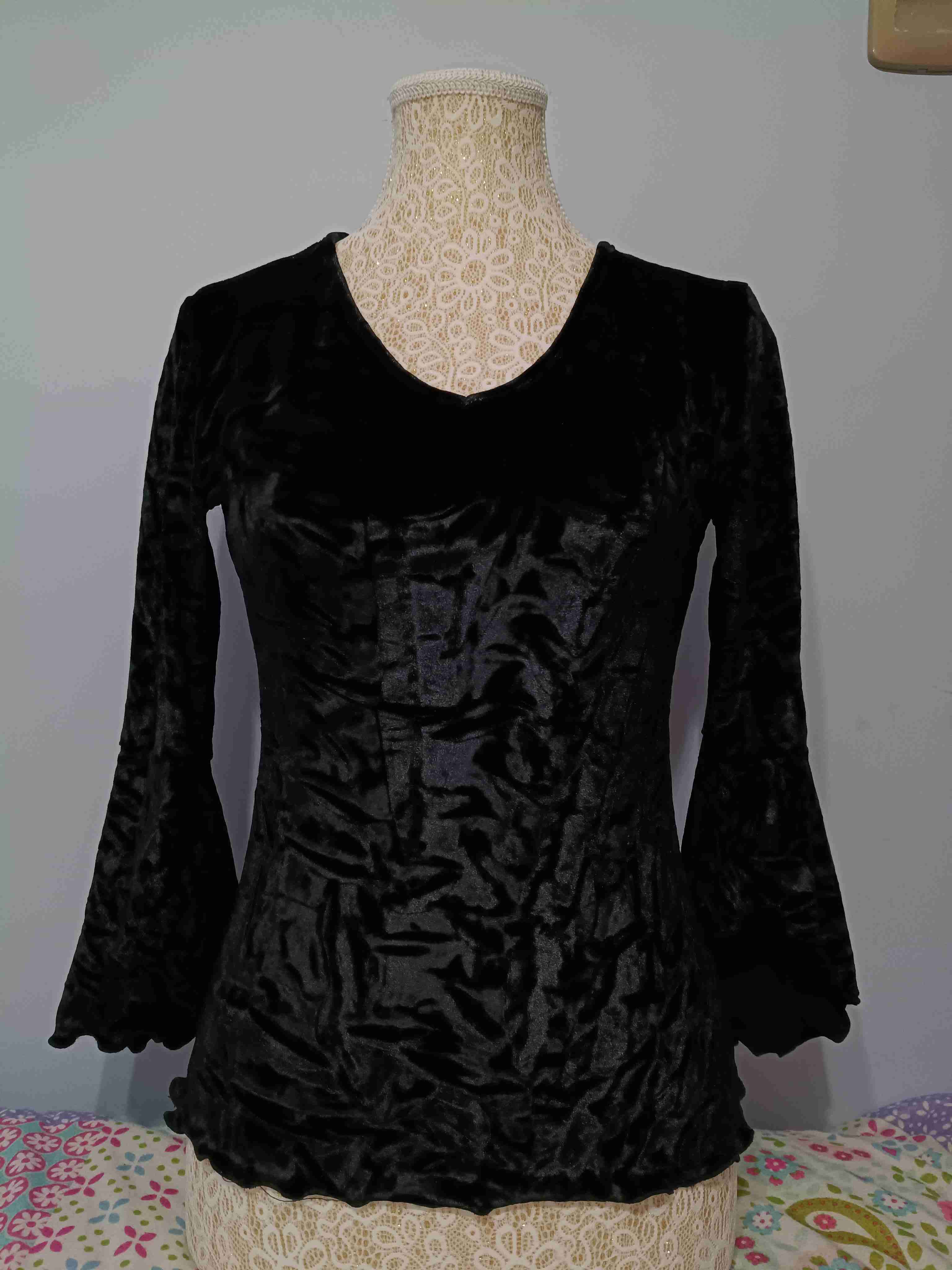 Polera negra de terciopelo con mangas acampanadas. Ideal para un look sofisticado. Talla M aproximadamente.