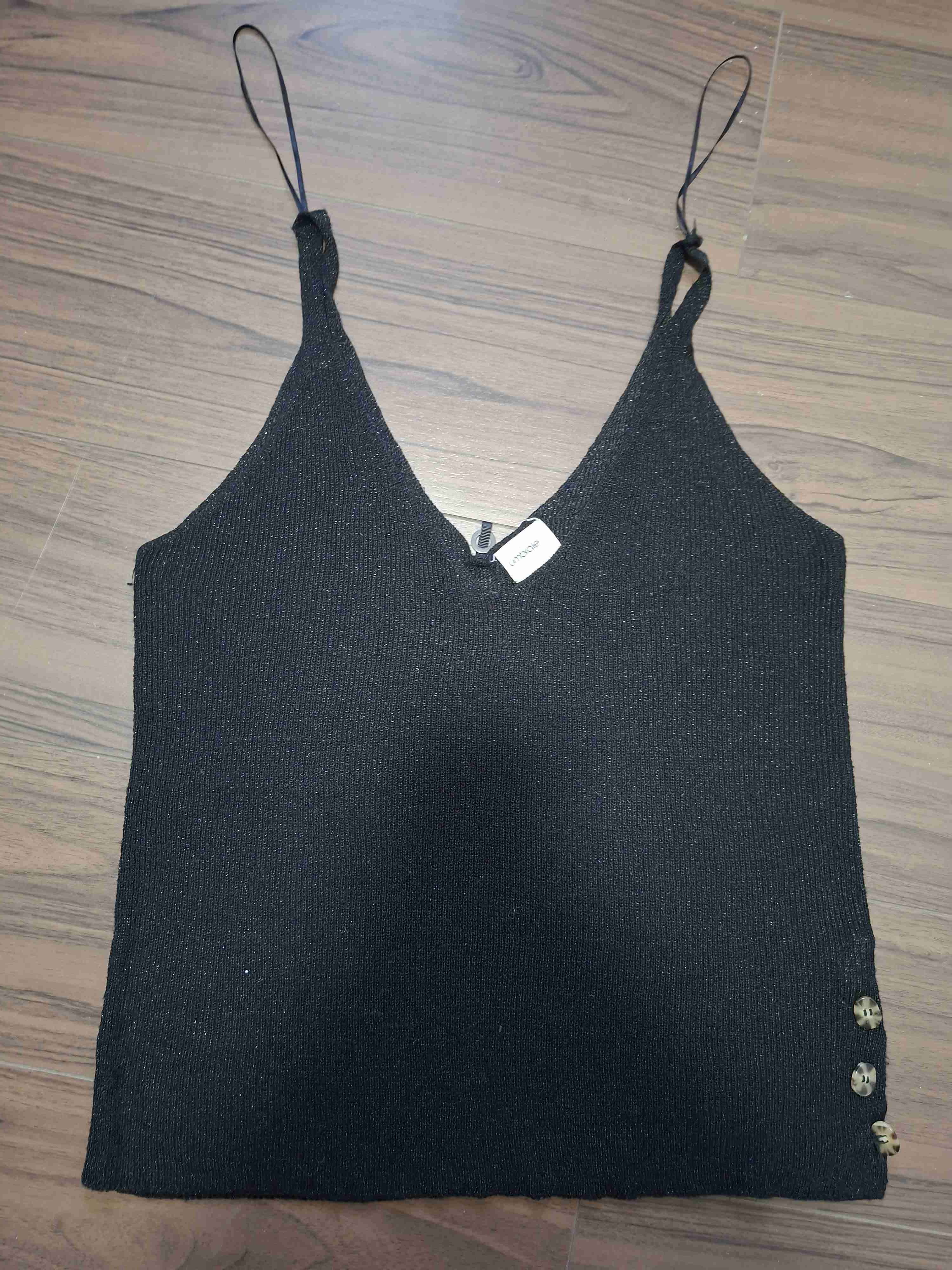 Top negro tejido de tirantes delgados con detalle de botones laterales, ideal para uso casual. En buen estado. Es un XL pequeño.