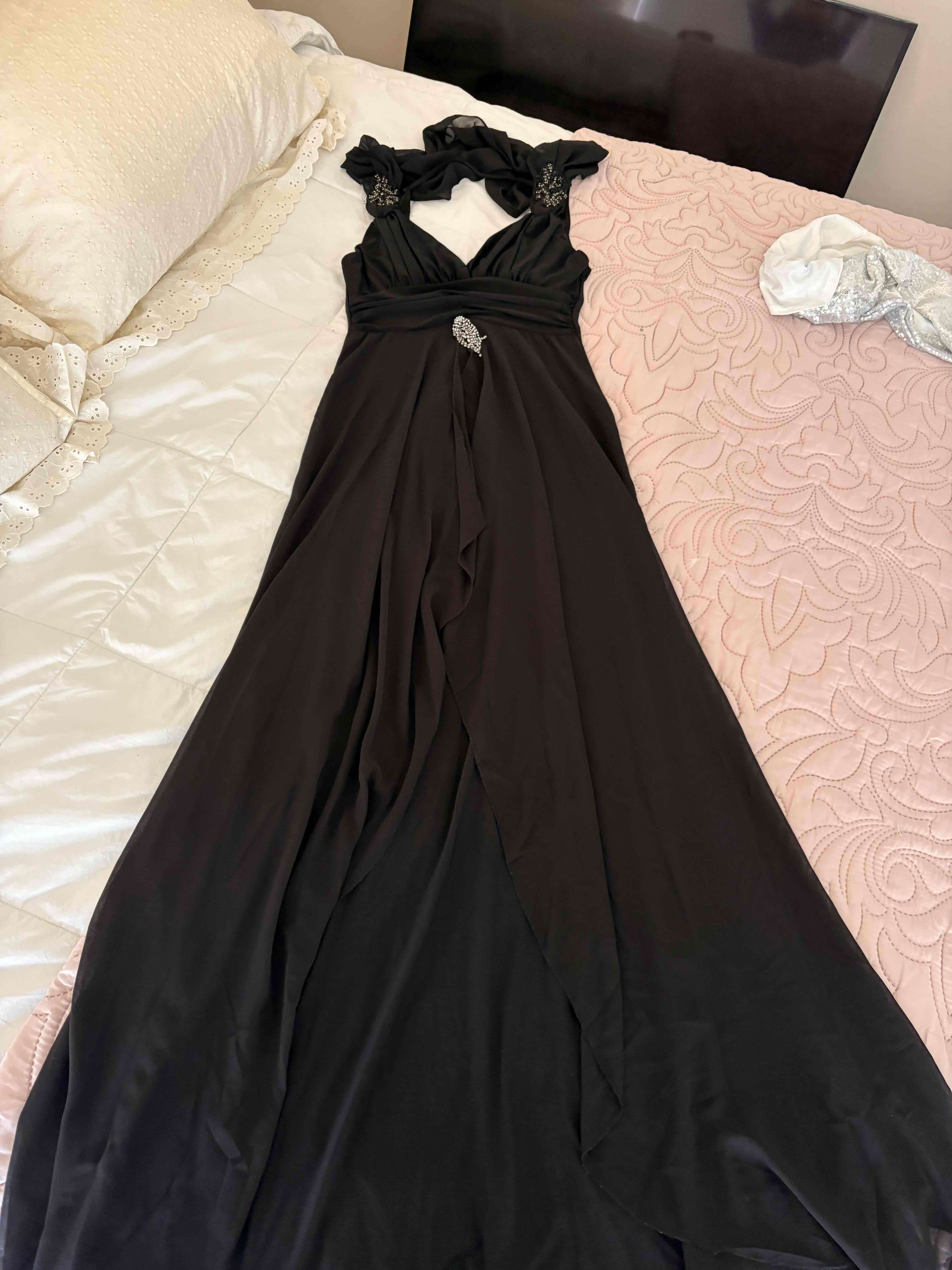 Vestido de fiesta negro largo de gasa con pedrería en tirantes, de corte imperial. Ideal para fiesta de gala. talla 40-42.