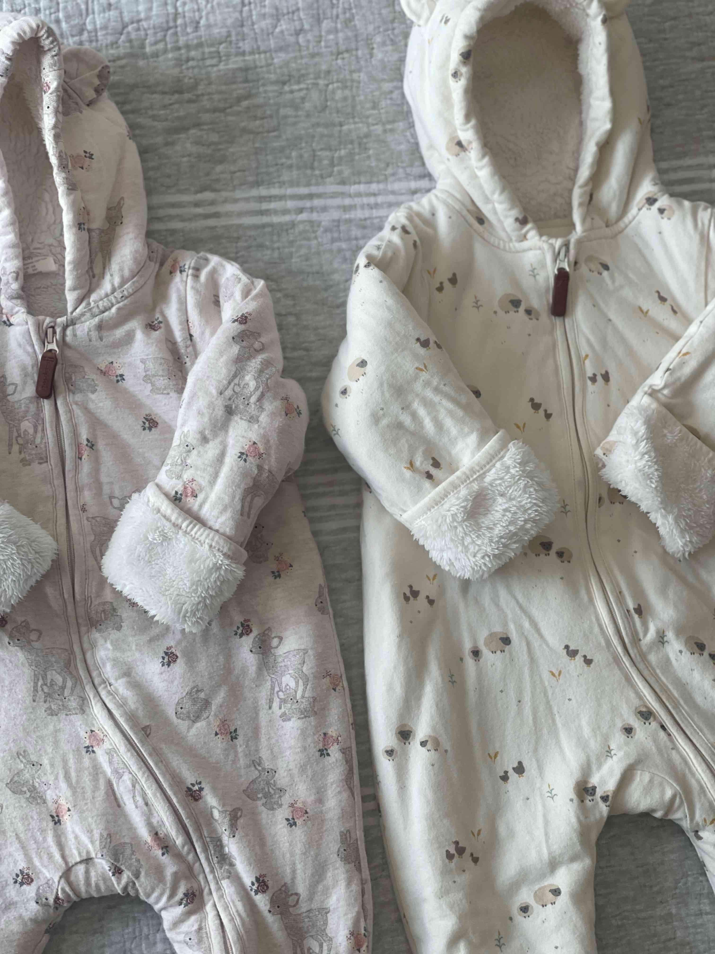 Dos mamelucos de polar con estampados de animales, perfectos para mantener a tu bebé abrigado. En excelente estado, muy poco uso. Marca H&M, talla 4-6 meses, precio ref: 30000 c/u. Tienen gorro con orejitas, cierre completo, y puños en brazos y pies para poder usar cerrado o abierto, según se requiera. Son muy útiles para el tiempo más frío.