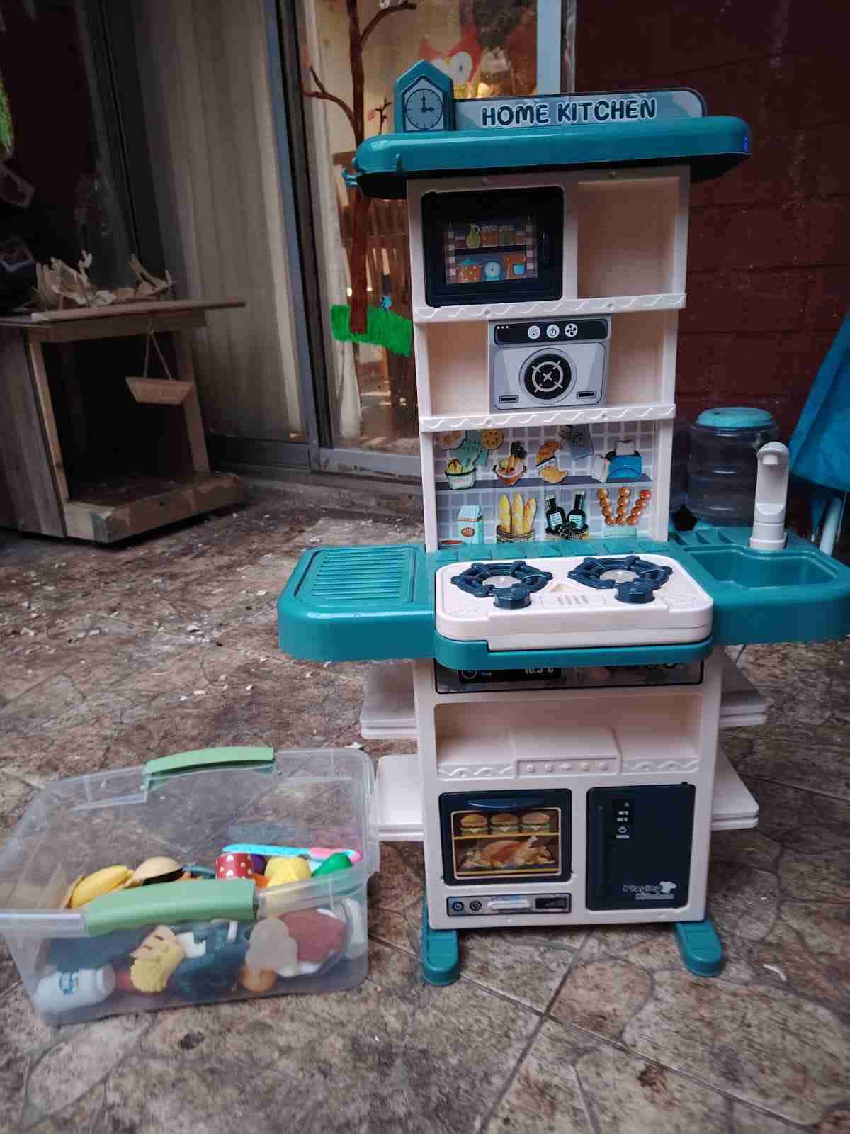 Cocina de juguete con accesorios, ideal para juegos creativos. En buen estado general, perfecta para niños.