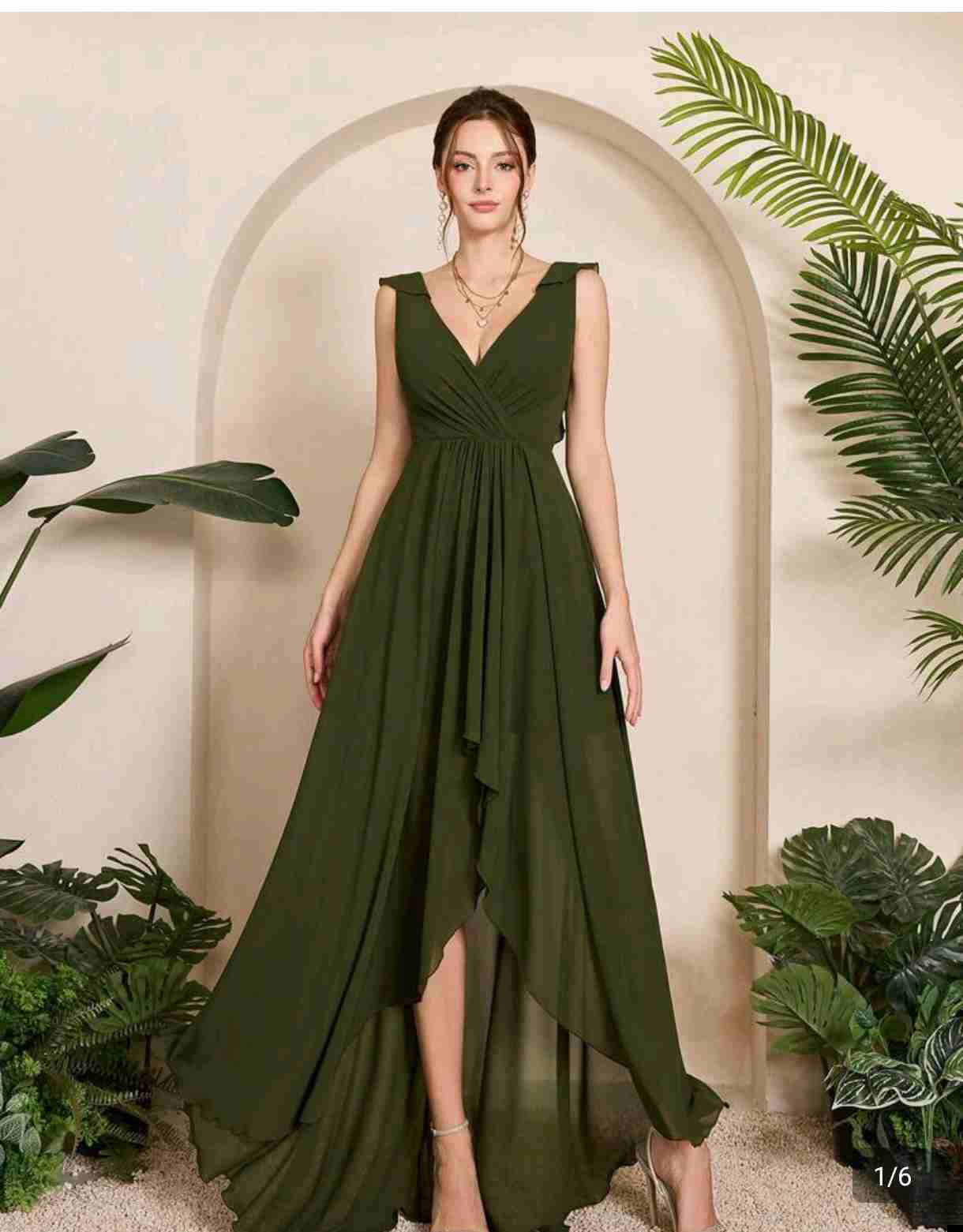 Vestido formal verde oliva con un elegante escote en V, cuerpo drapeado y una falda vaporosa con corte asimétrico high-low. Es talla M, lo vendo en talla L tambien (en la foto usando L). Medidas: Pecho 94 cm, cintura 76 cm, Largo 156 cm. La tela es gasa 100% poliester con un forro en su interior, transpirable y comodo para bailar. Sin uso. Perfecto para lucir estupenda en cualquier evento especial.