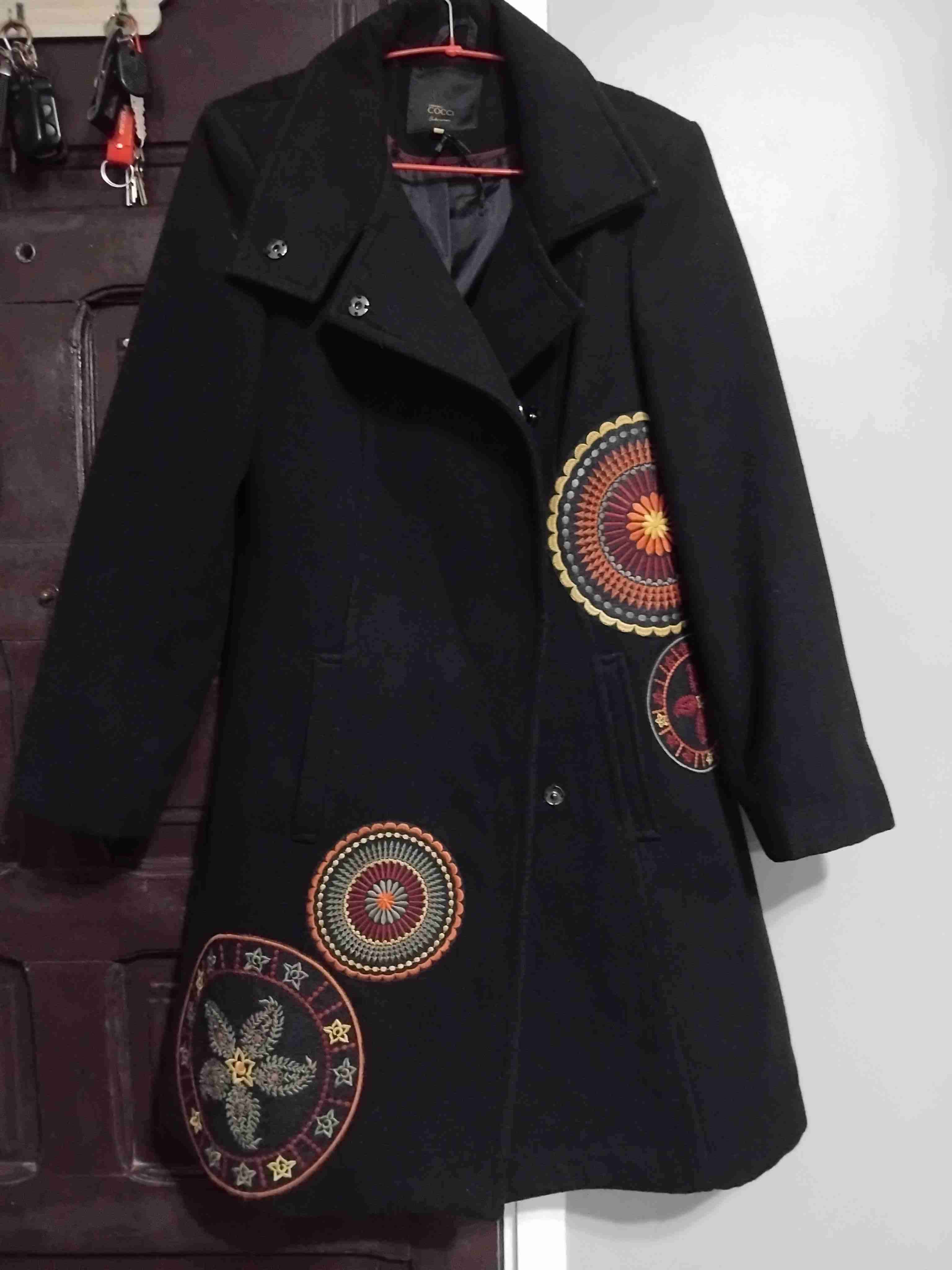 Abrigo de lana negro con detalles bordados coloridos. Ideal para días fríos. En buen estado.