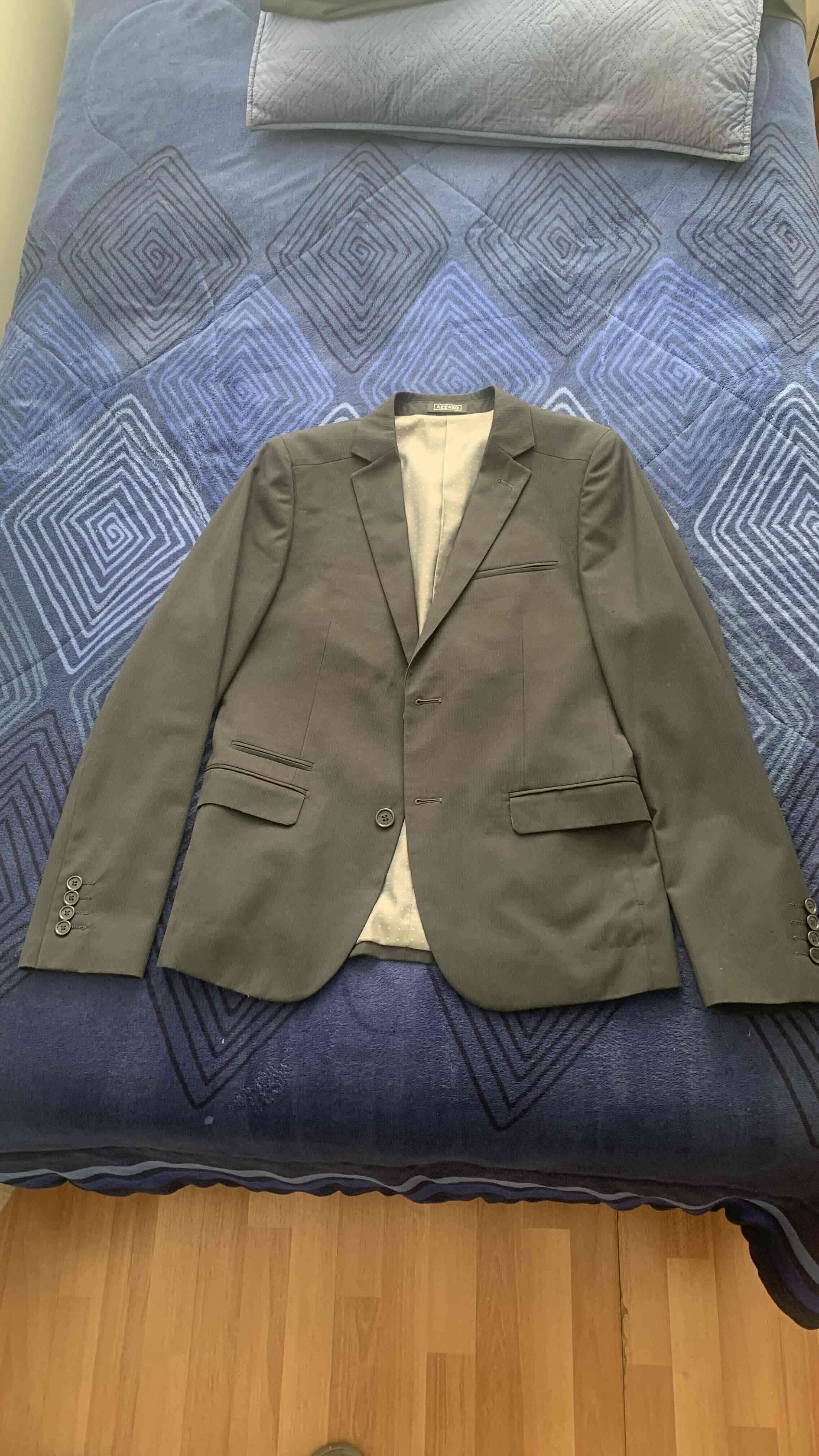 Elegante blazer gris, ideal para ocasiones formales. En buen estado, talla 42. Pantalón: - Cintura: 40cm - Largo: 100cm Chaqueta: - Hombros: 43cm - Largo de mangas: 65cm