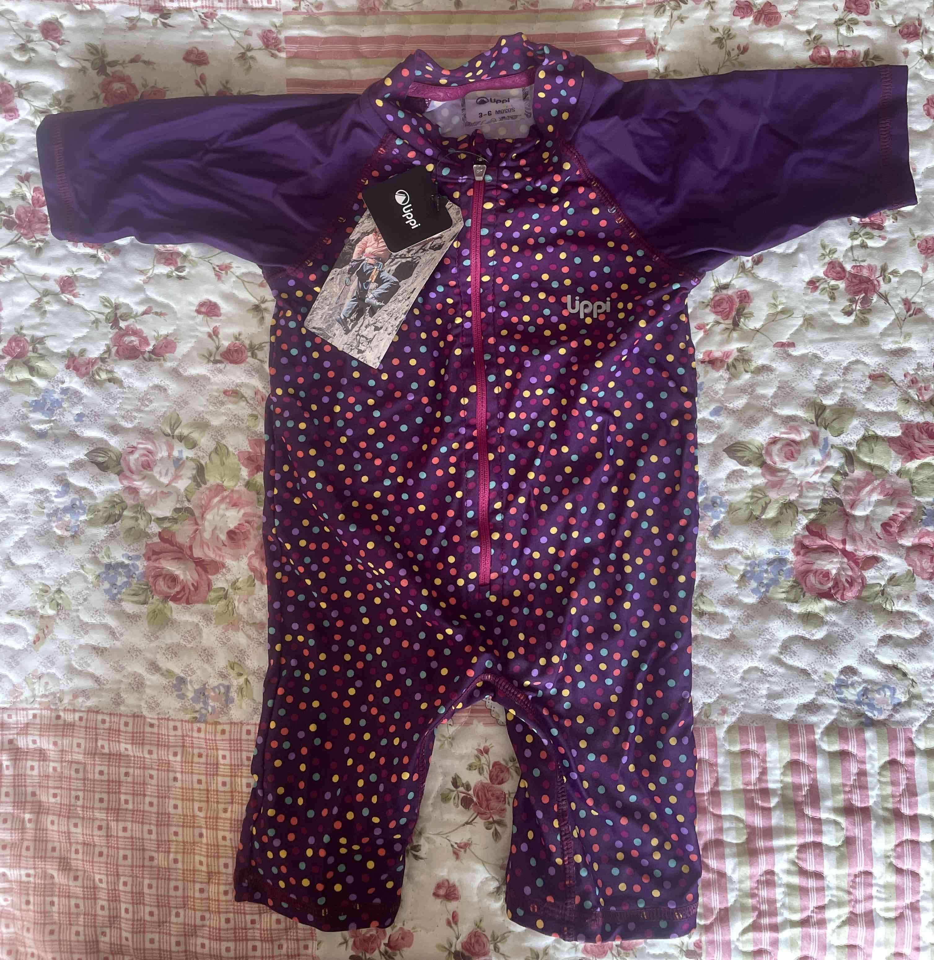 Traje de baño para niña, color morado con puntos de colores. Ideal para la playa o la piscina.3-6 meses Nuevo con etiquetas.