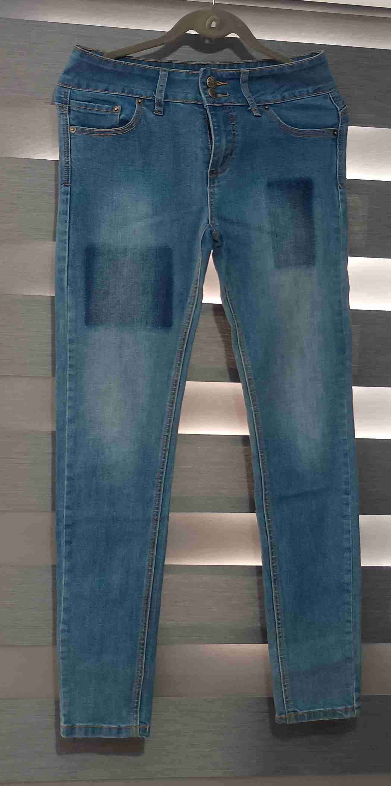 Jeans ajustados de color azul con parches claros. Ideal para un look casual. En buen estado, muy poco uso