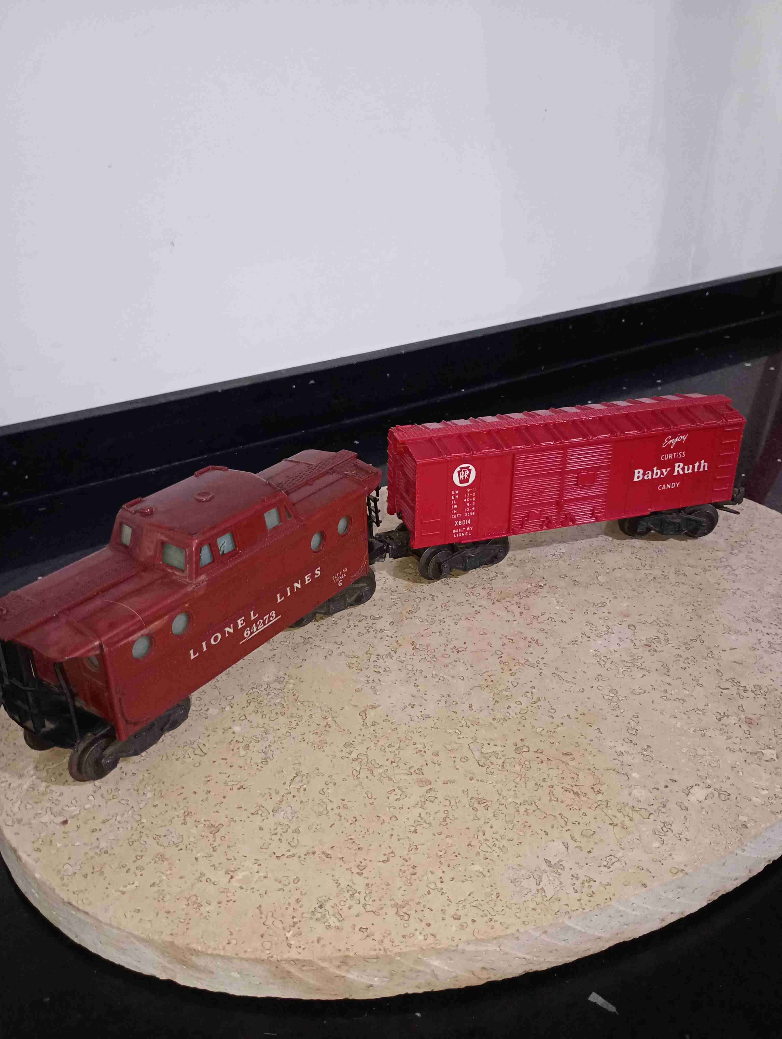 Tren locomotora y vagón vintage Lionel con diseño clásico en rojo, ideal para coleccionistas. Está en buenas condiciones con algunos signos de uso.