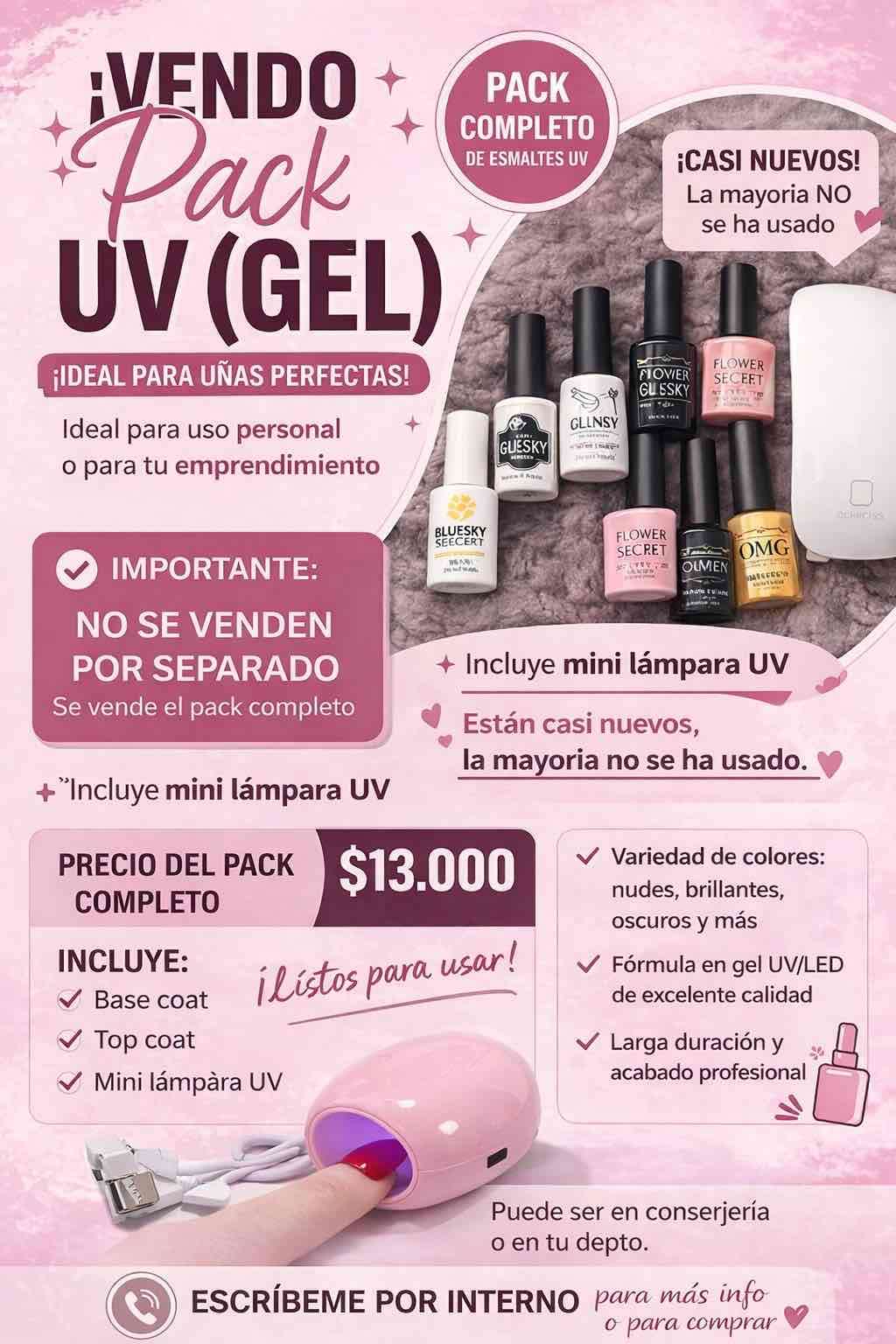 Ideal para uso personal o emprendimiento. Incluye una mini lámpara UV y variedad de colores. Producto casi nuevo.