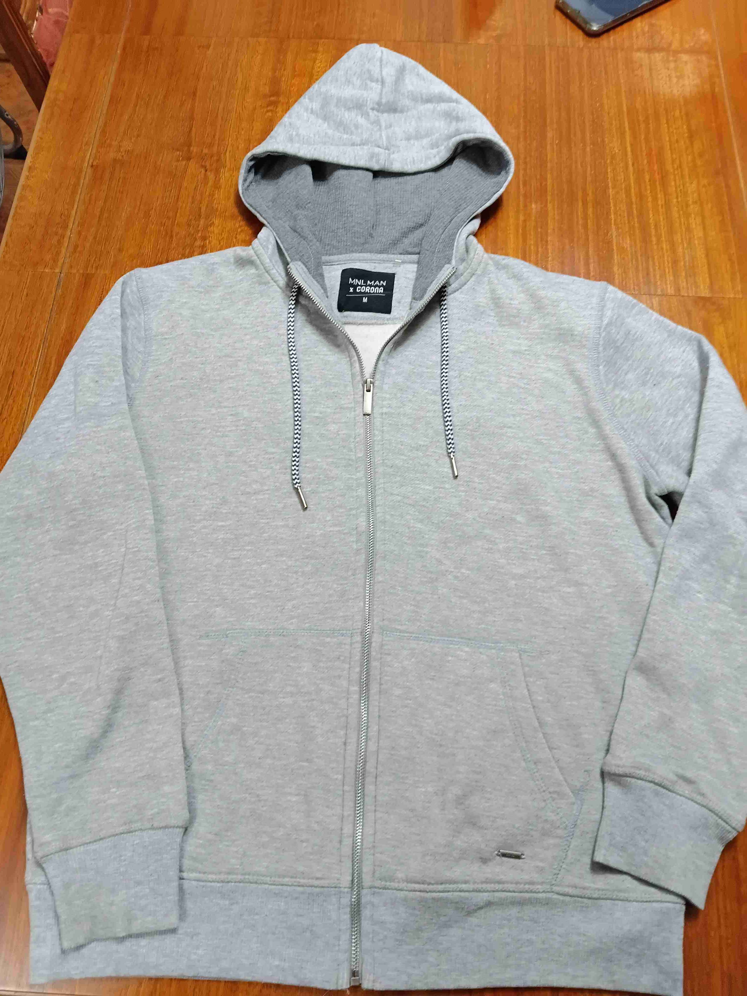 Polerón gris con capucha y cierre, talla M. Ideal para días frescos, en buen estado.