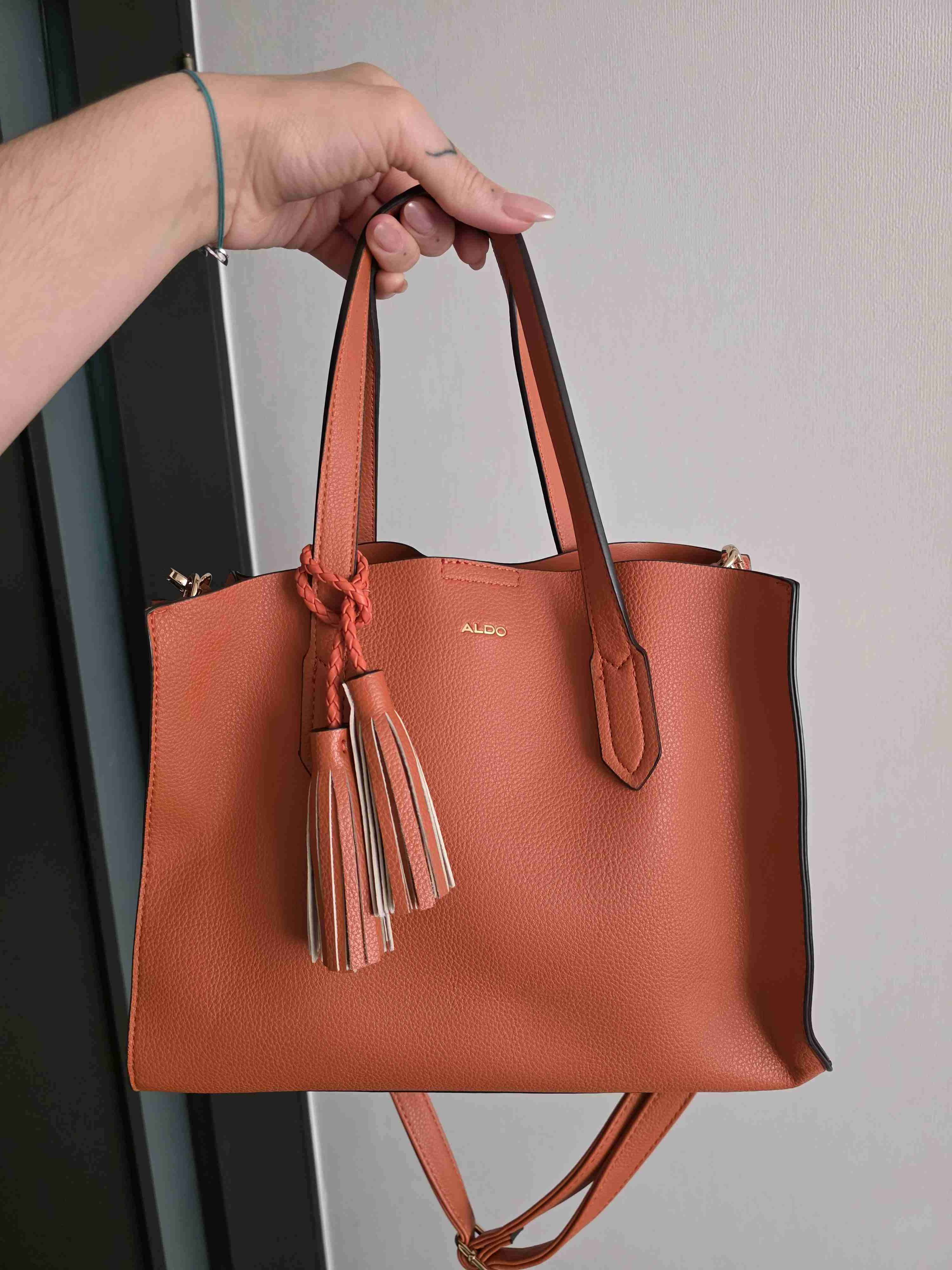 Cartera de mano color naranja, estilo moderno con detalles de borlas. Perfecta para uso diario.
