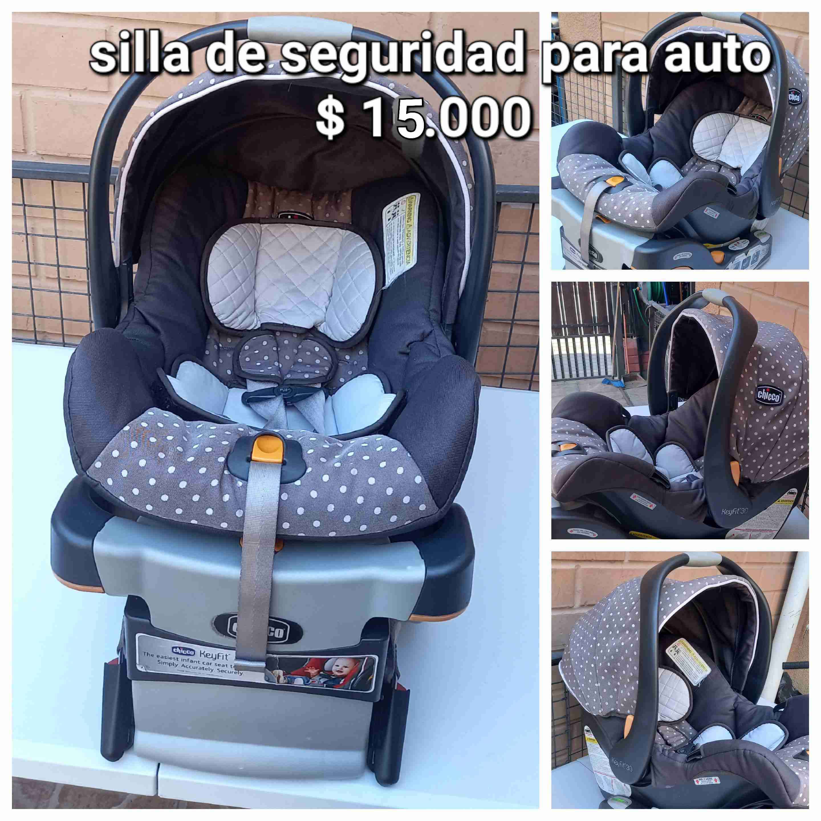 Silla de seguridad para auto en buen estado. Color gris con lunares blancos, acolchada y cómoda para bebés. Ideal para viajes seguros.