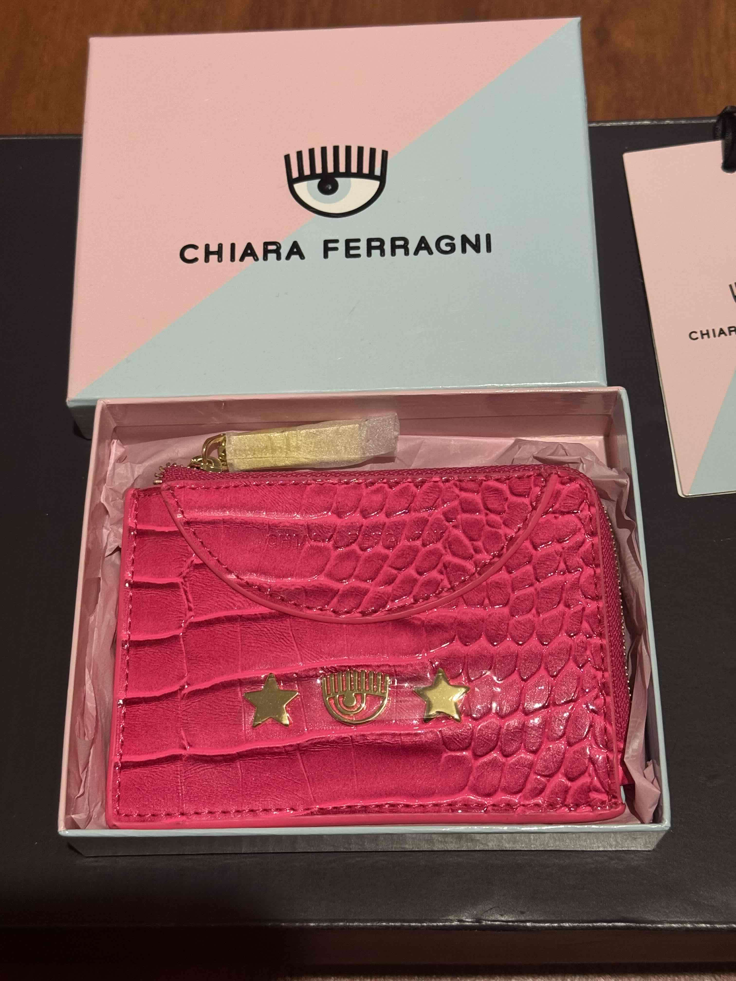 Billetera de mujer marca Chiara Ferragni en color rosa brillante con textura cocodrilo. Ideal para complementar tu estilo elegante.