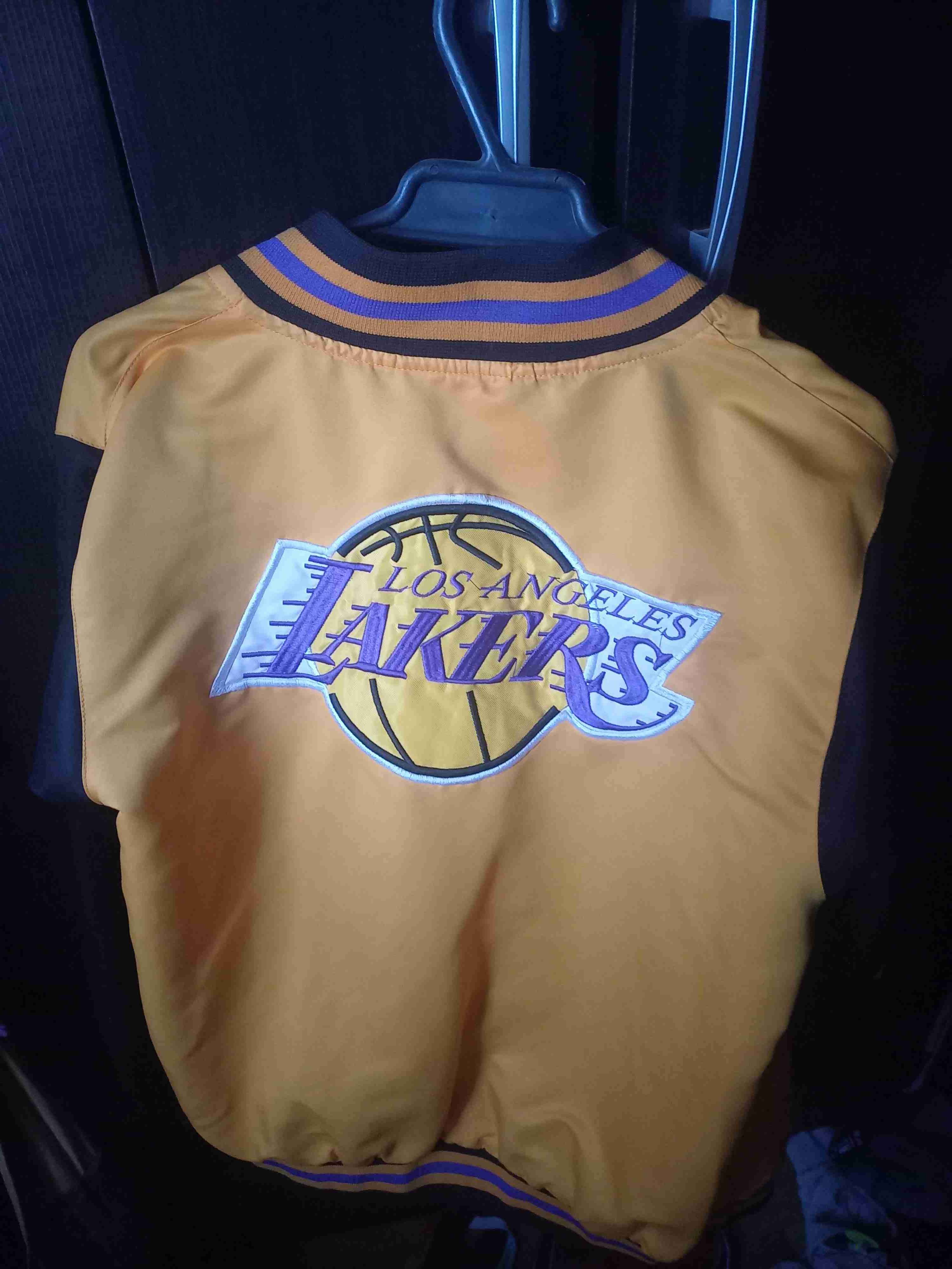 Chaqueta de Los Angeles Lakers dorada, estilo deportivo, ideal para fanáticos del básquetbol. En buen estado.