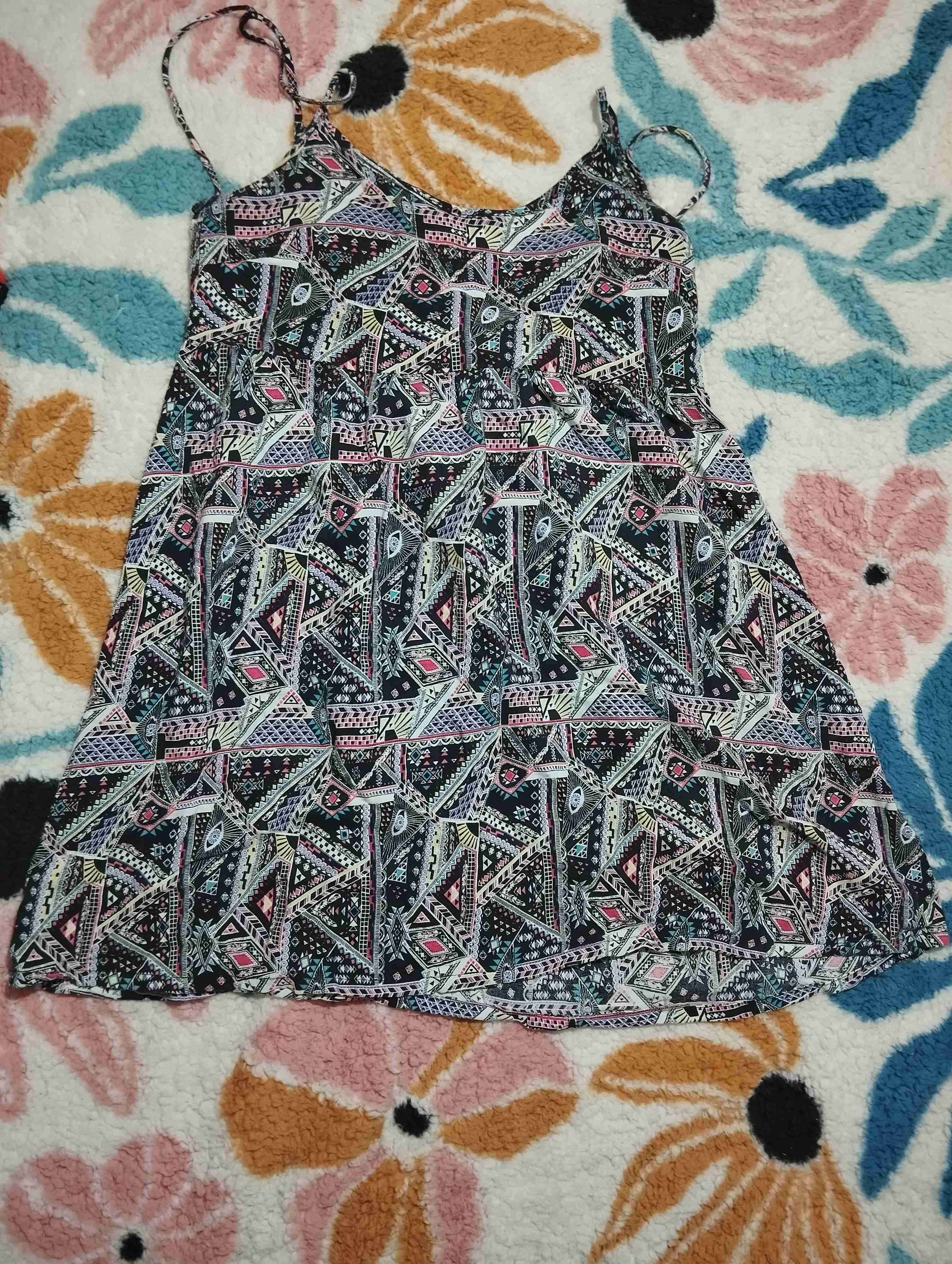 Vestido con estampado geométrico se ajusta en espalda, tiras ajustables, largo total 80cm con tirantes, cintura 38cm