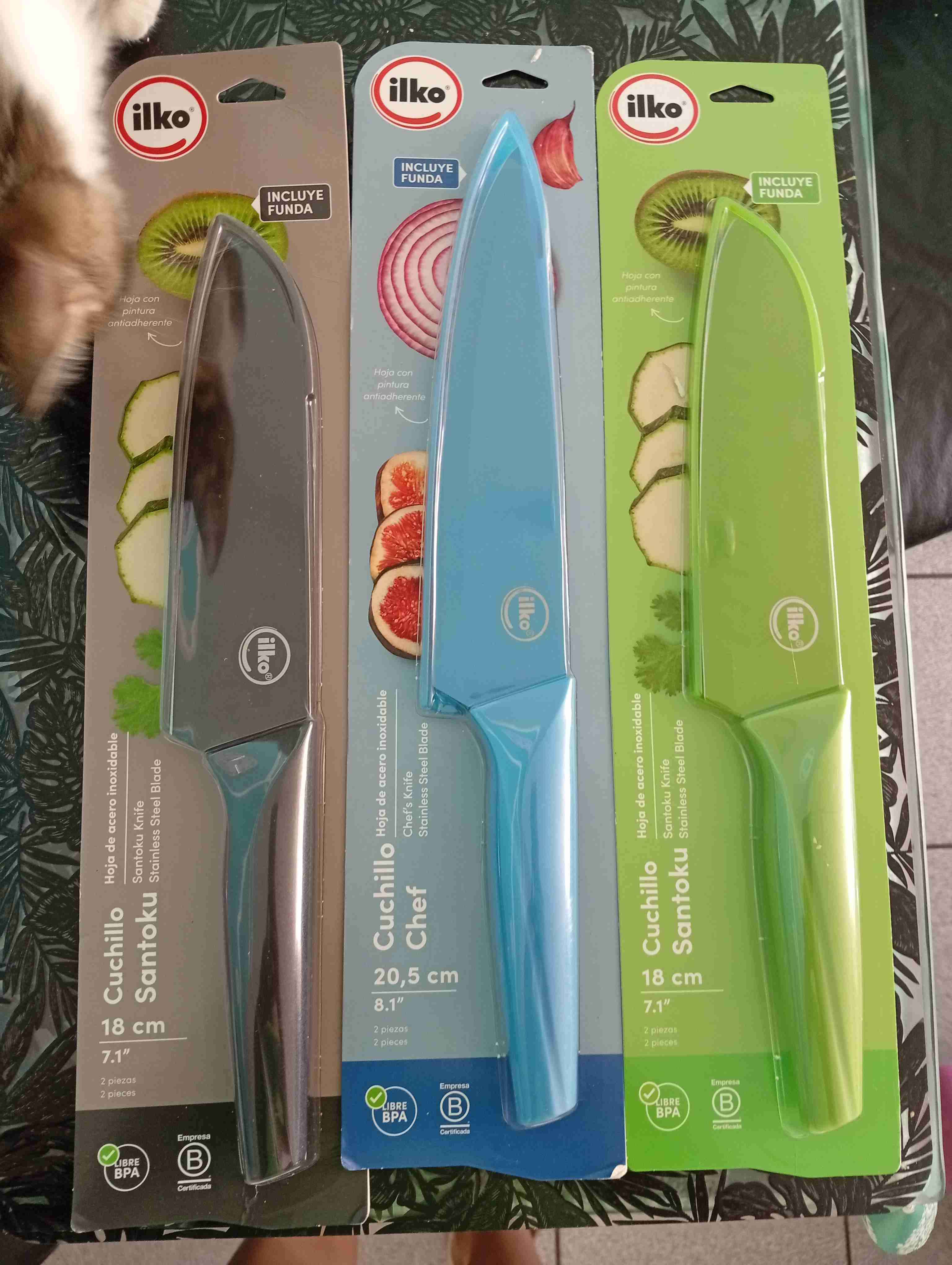 Set de cuchillos con hojas de acero inoxidable y pintura antiadherente. Incluye funda para cada cuchillo. Ideal para cocina diaria.