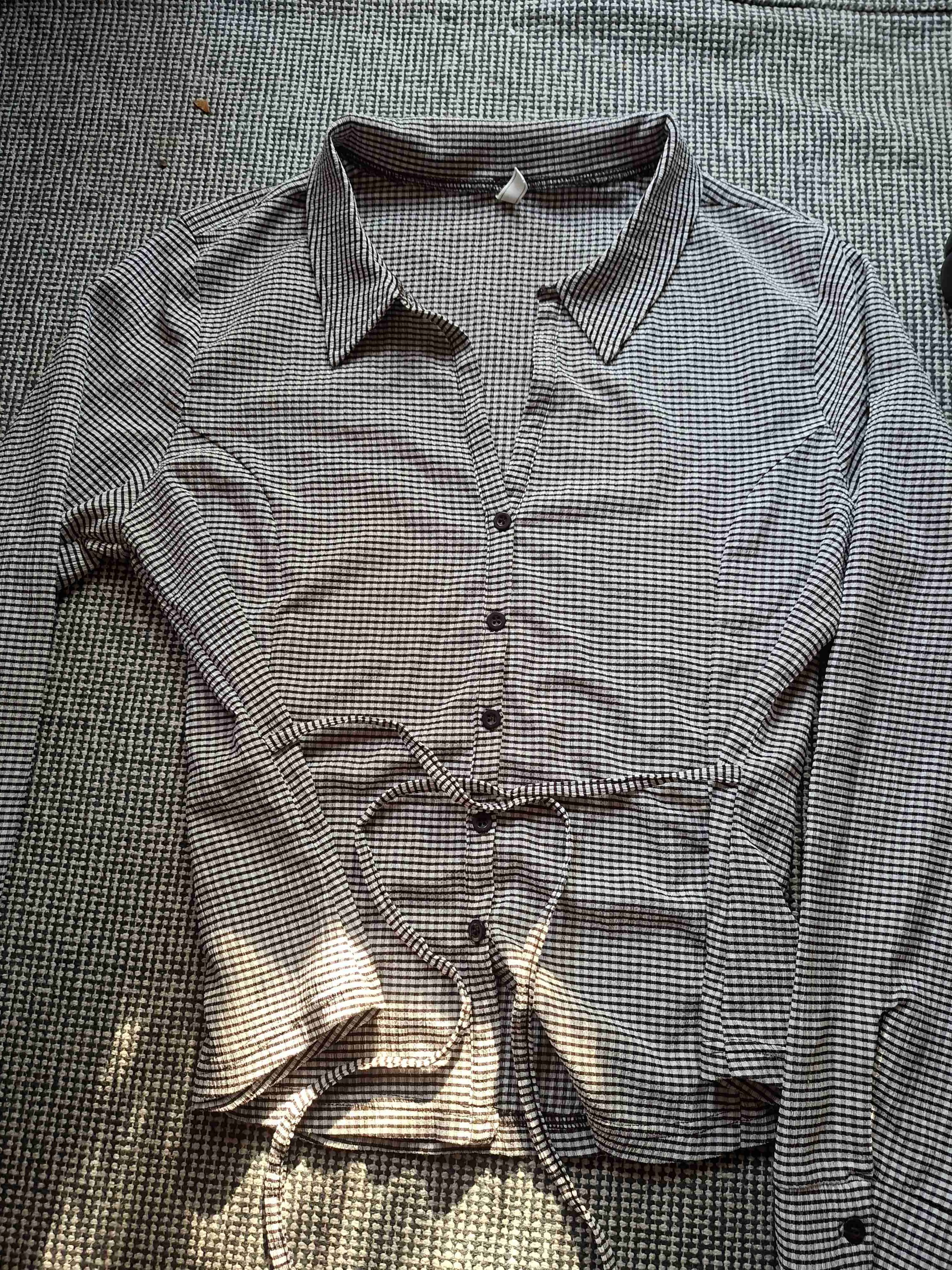 Blusa de tela ligera con diseño a cuadros pequeños tonos oscuros, nueva, 0 uso. Talla L diría que es más un M, puedo dar medidas x dm Se ajusta a la cintura