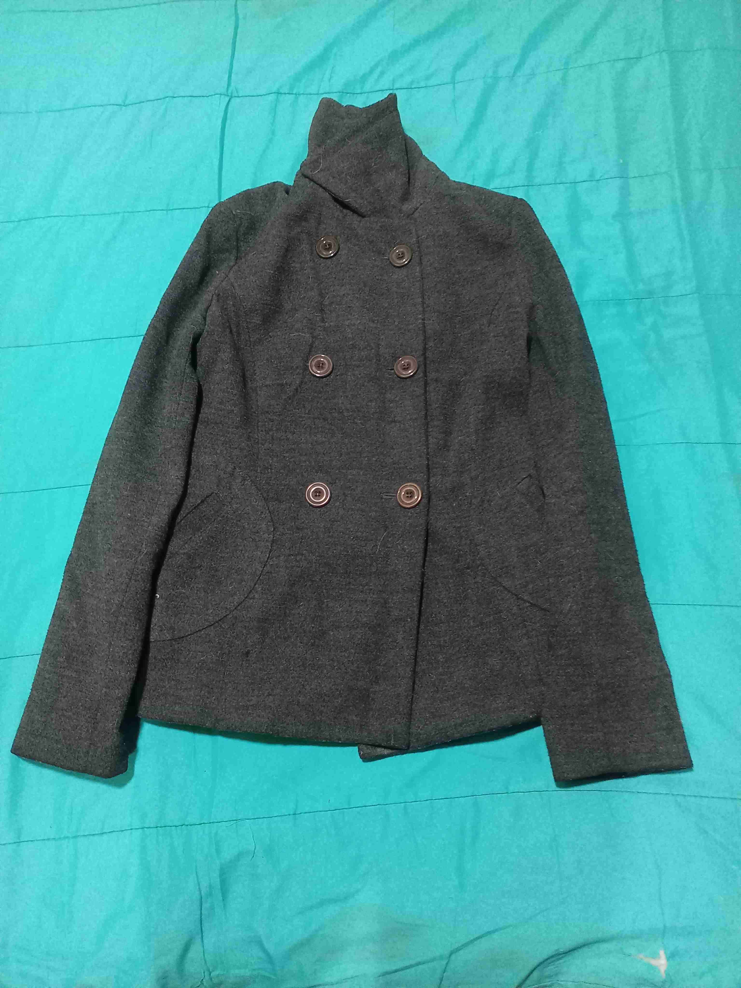 Abrigo elegante color gris oscuro, ideal para el invierno. En buen estado con un diseño clásico de botones dobles.