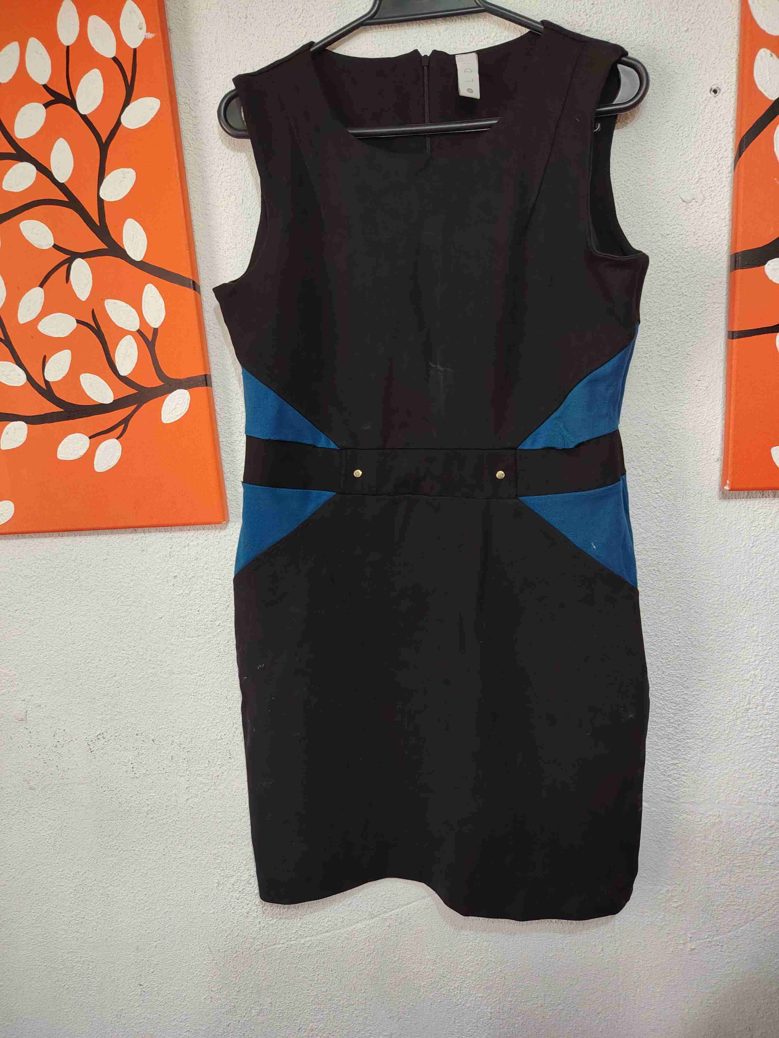 Vestido elegante estasticago, grueso, sin mangas, corto, con detalles en azul. Perfecto para ocasiones especiales. En buen estado.