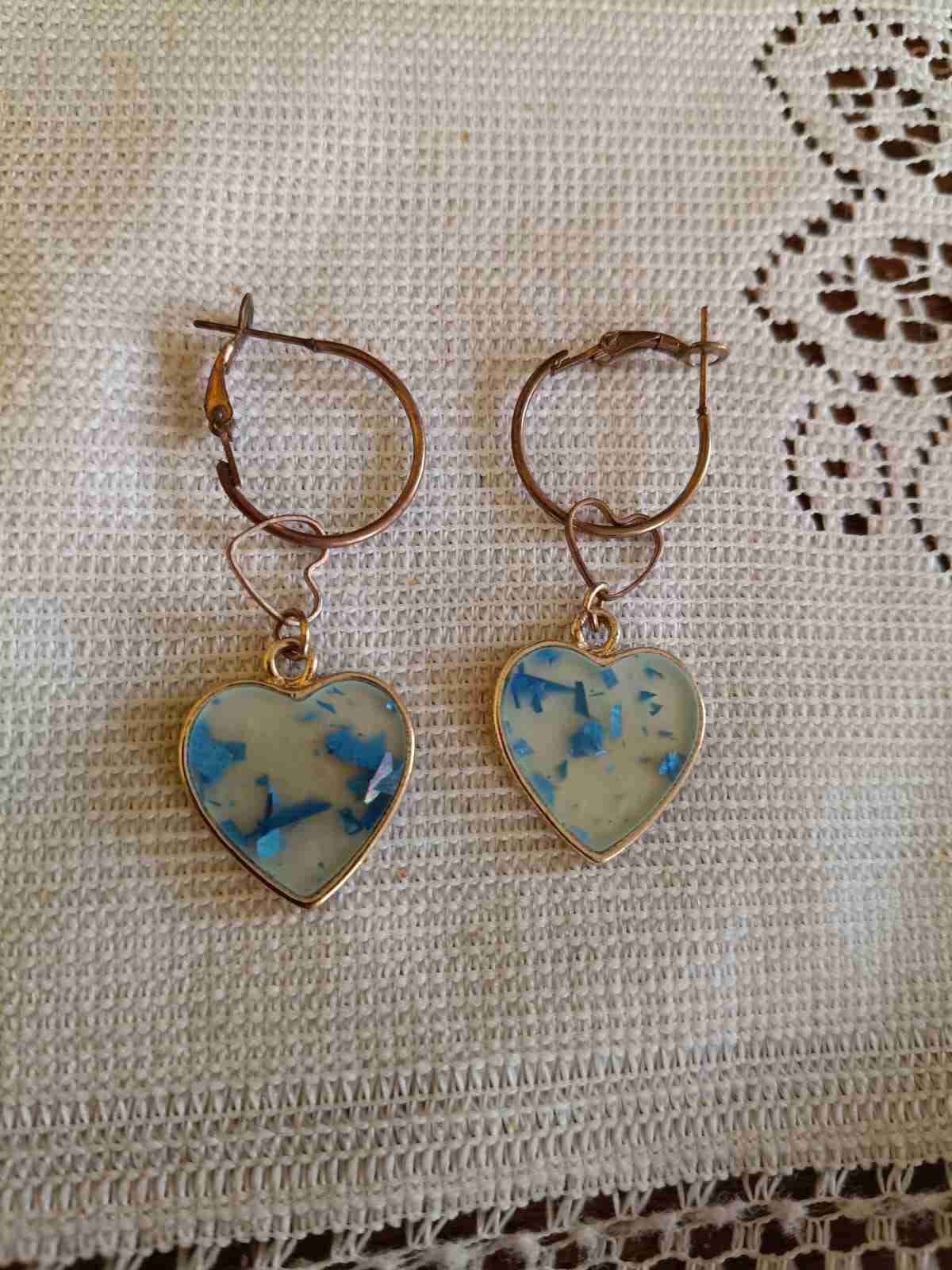 Aros dorados en forma de corazón con detalles azules. Perfectos para un look casual. Buen estado.