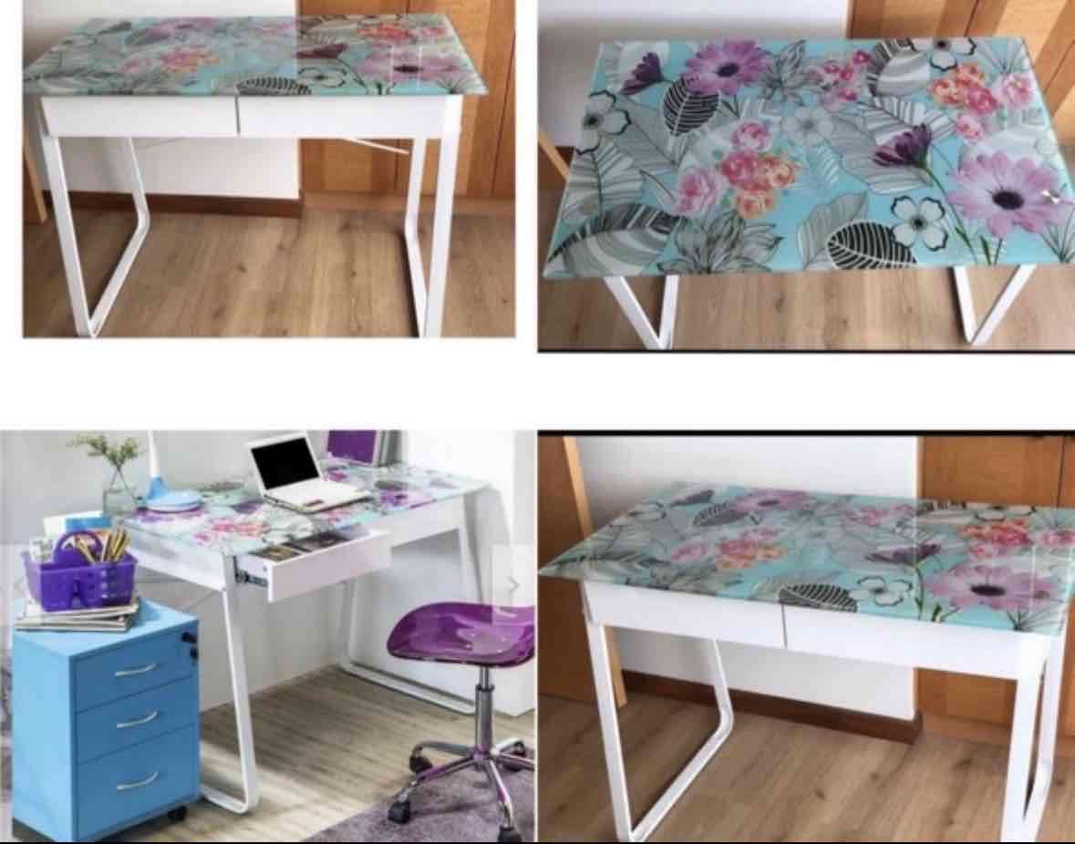 Escritorio moderno, ideal para oficina en casa. Cubierta floral de vidrio en buen estado.