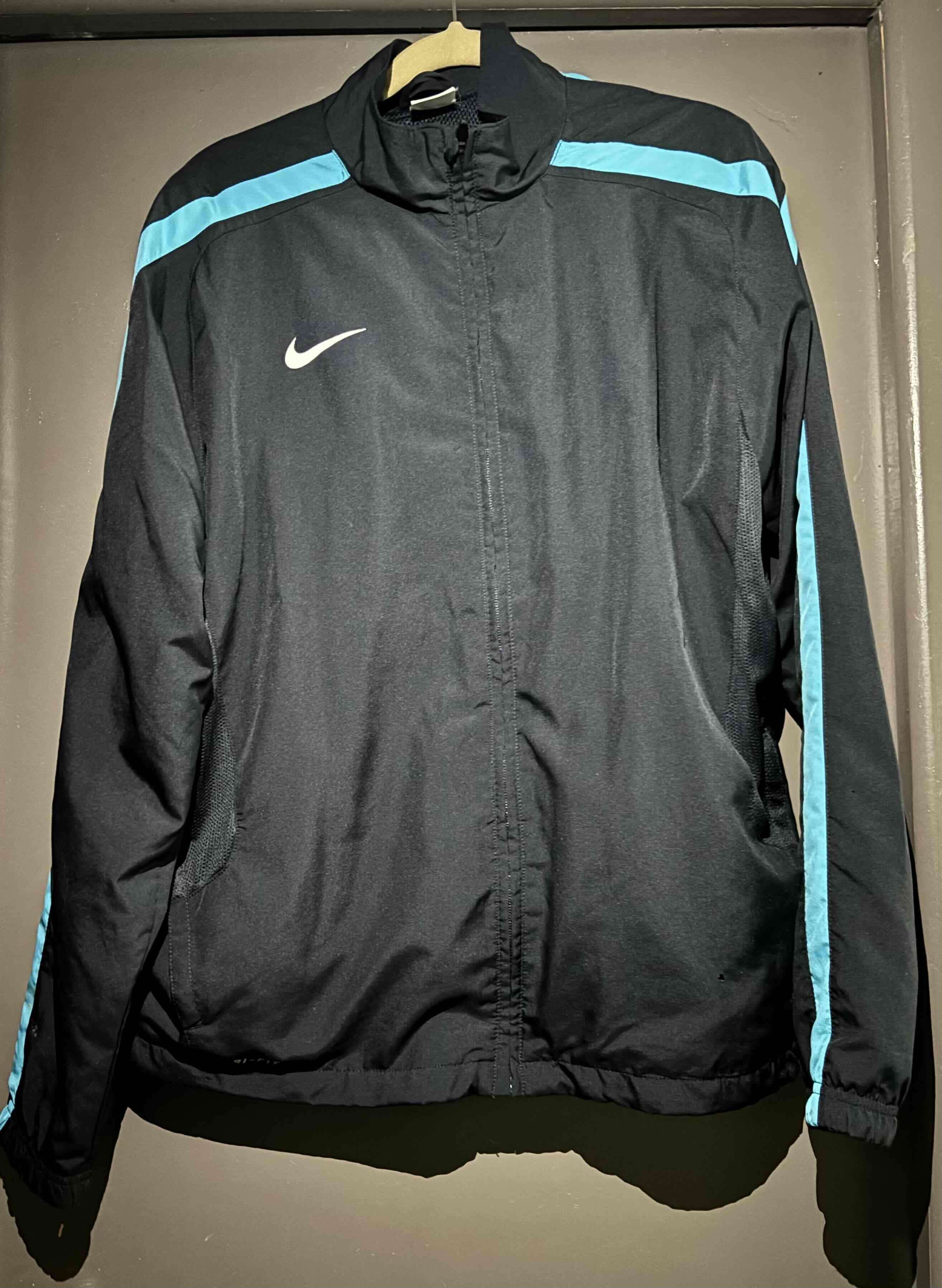 Chaqueta deportiva negra con detalles turquesa. En buen estado, ideal para actividades al aire libre.(detalle: quemadora de cigarro, poco visible)