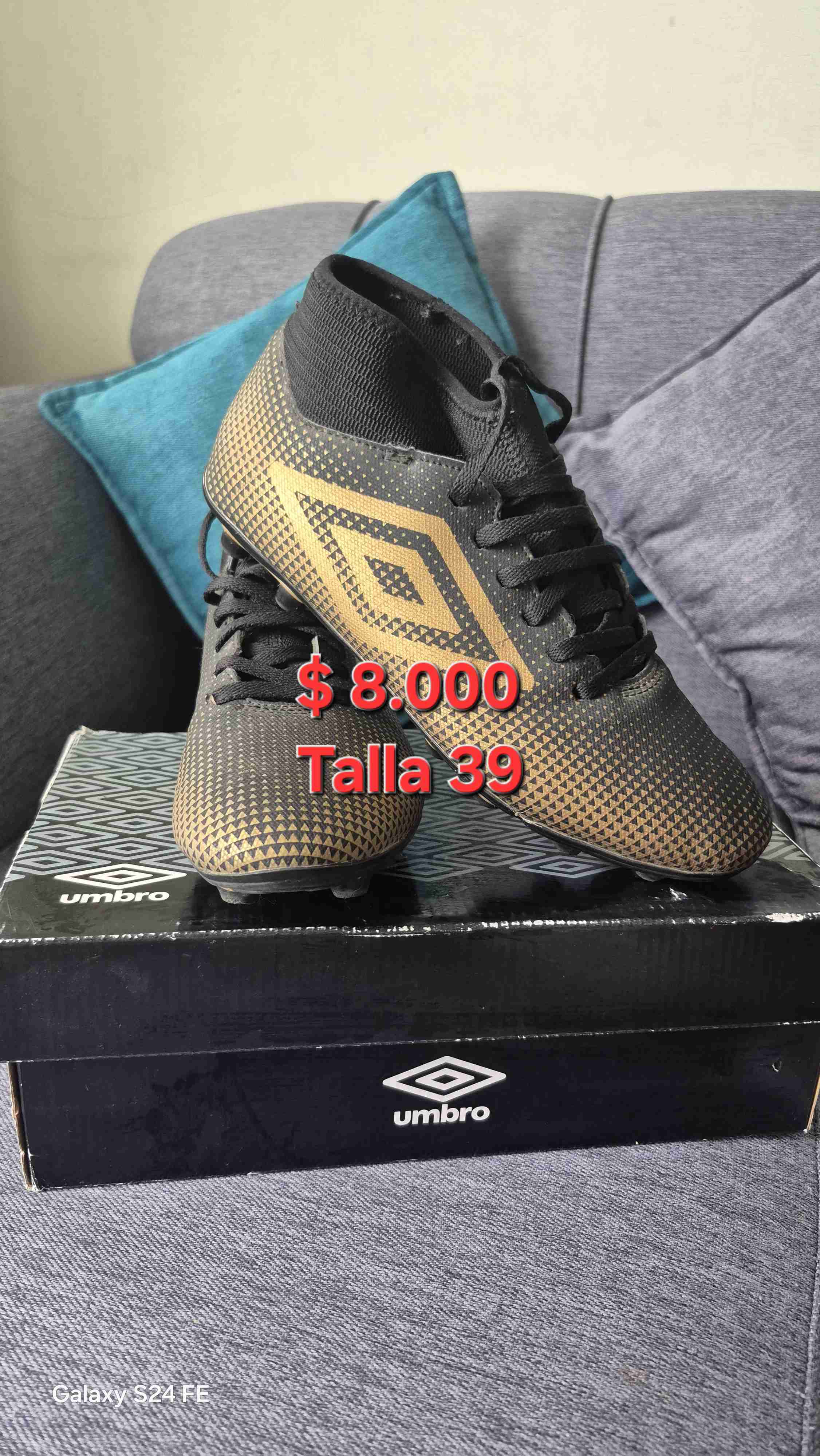 Zapatos deportivos en buen estado, ideales para fútbol. Diseño en negro y dorado, talla 39.