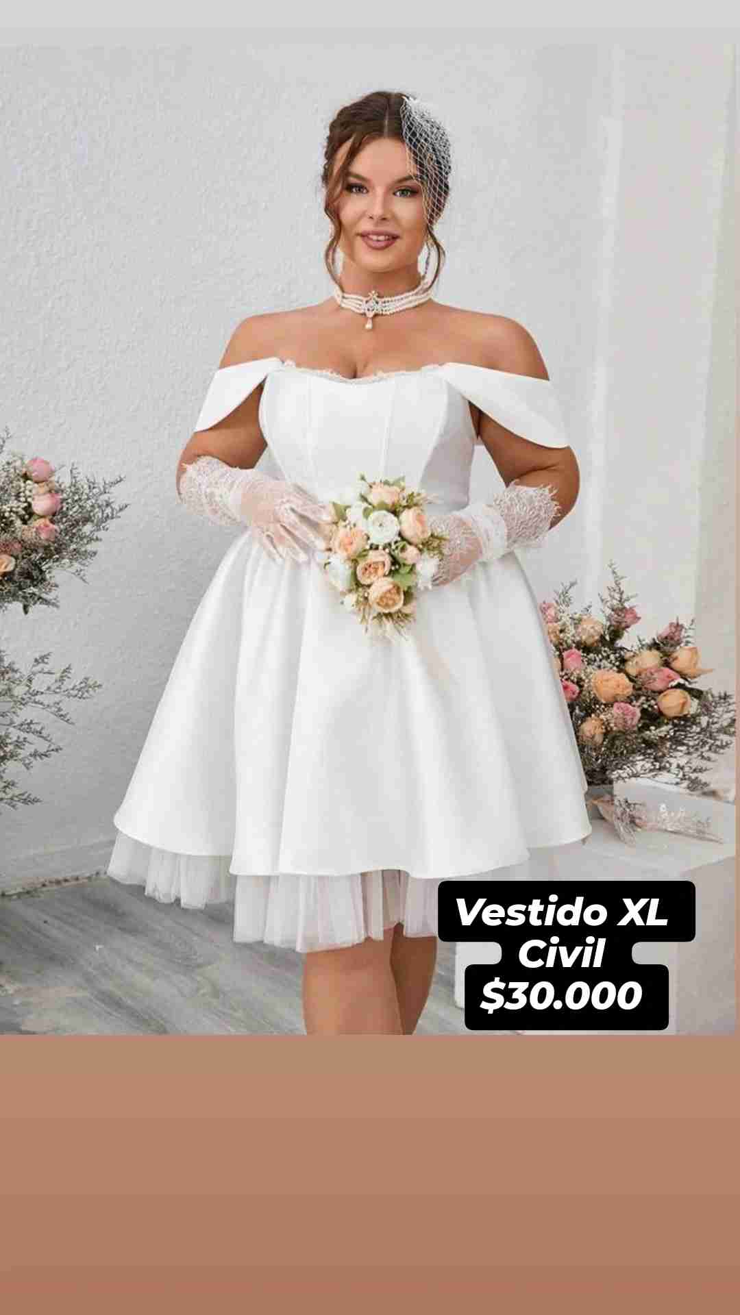 Hermoso vestido de novia corto, ideal para ceremonia civil. Estilo elegante y romántico.
