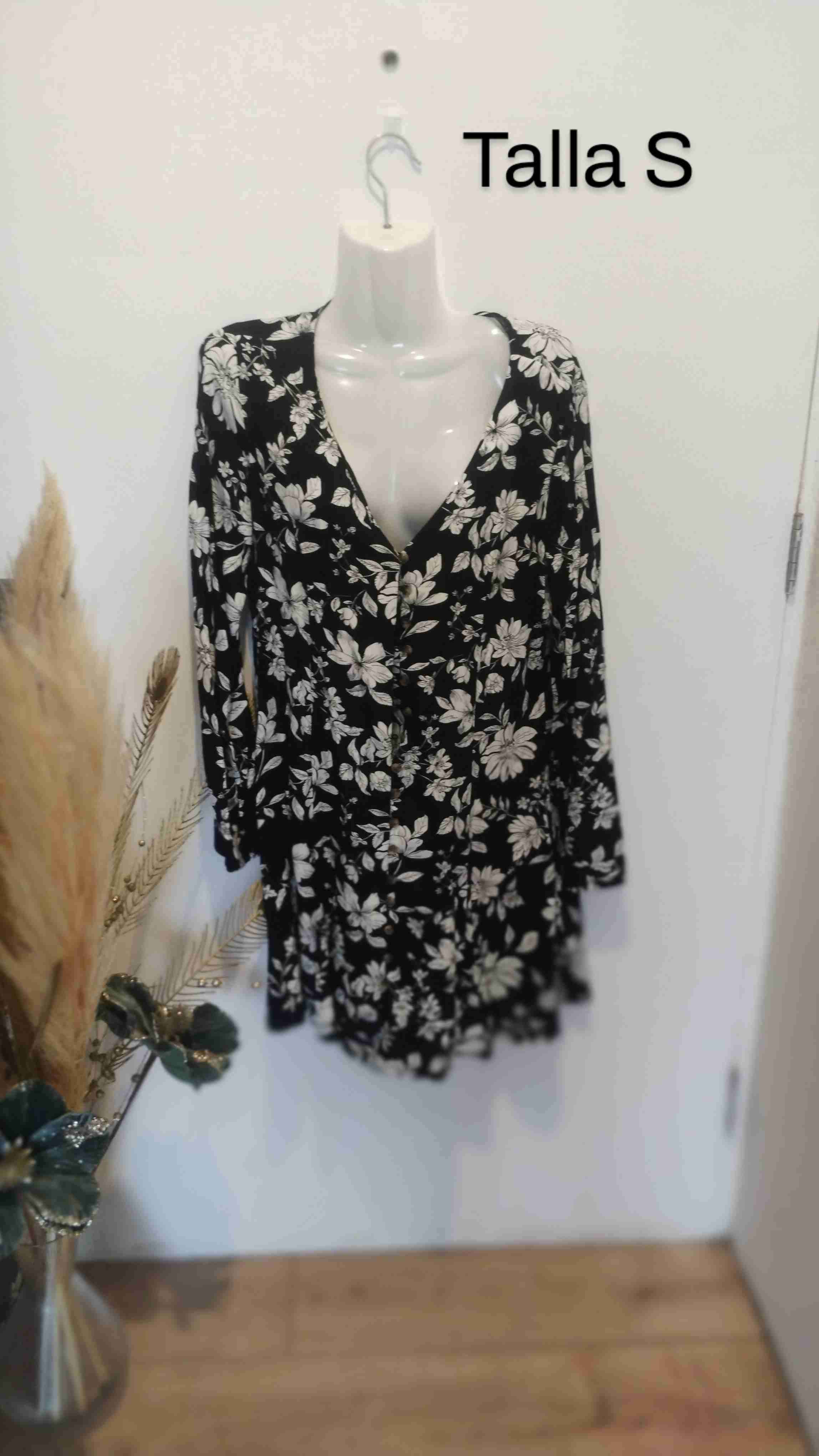 Vestido corto negro con estampado floral blanco. Ideal para el día a día o eventos casuales. En buen estado.