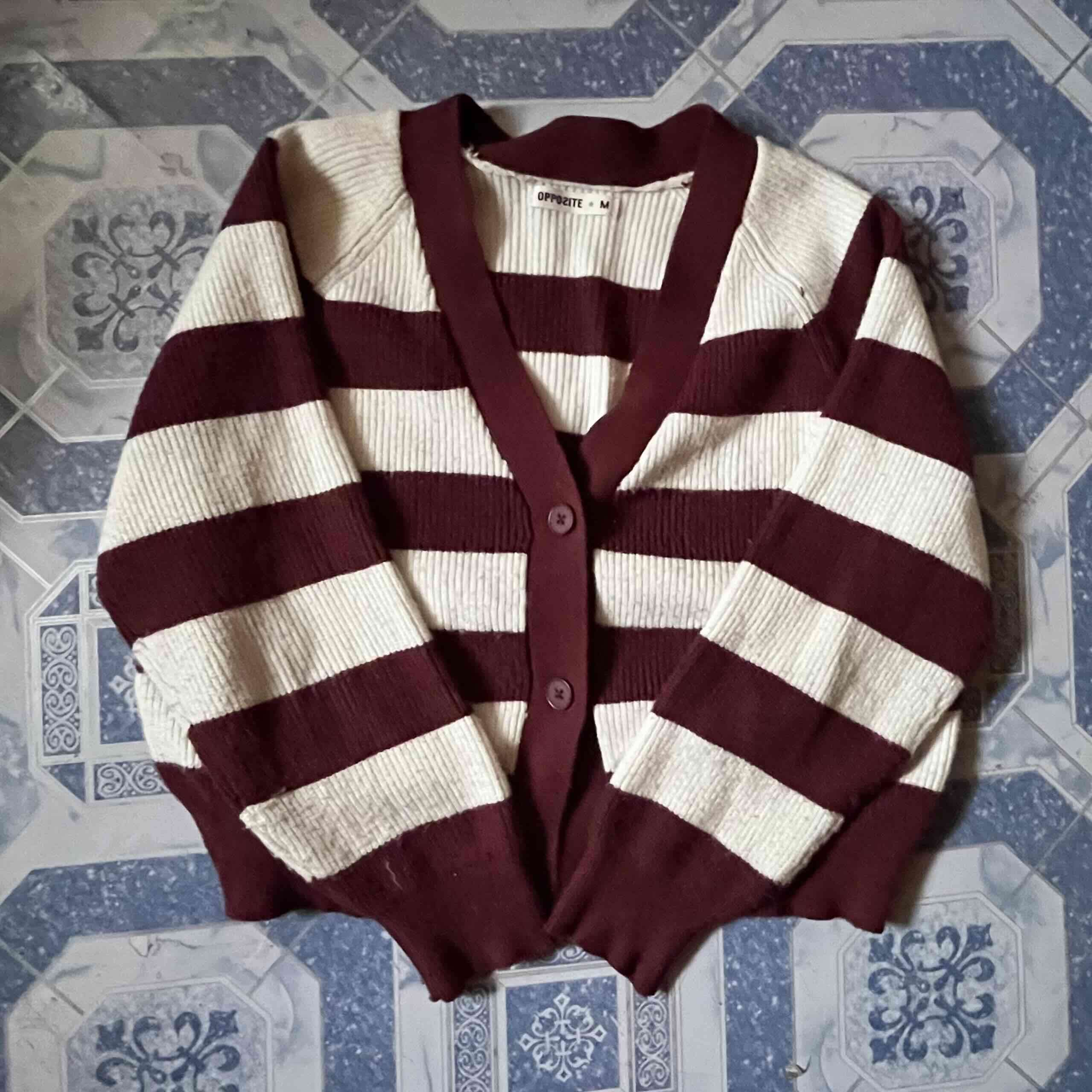 Cardigan rayado de botones, ideal para el otoño. En buen estado general con leves signos de uso. Talla M.