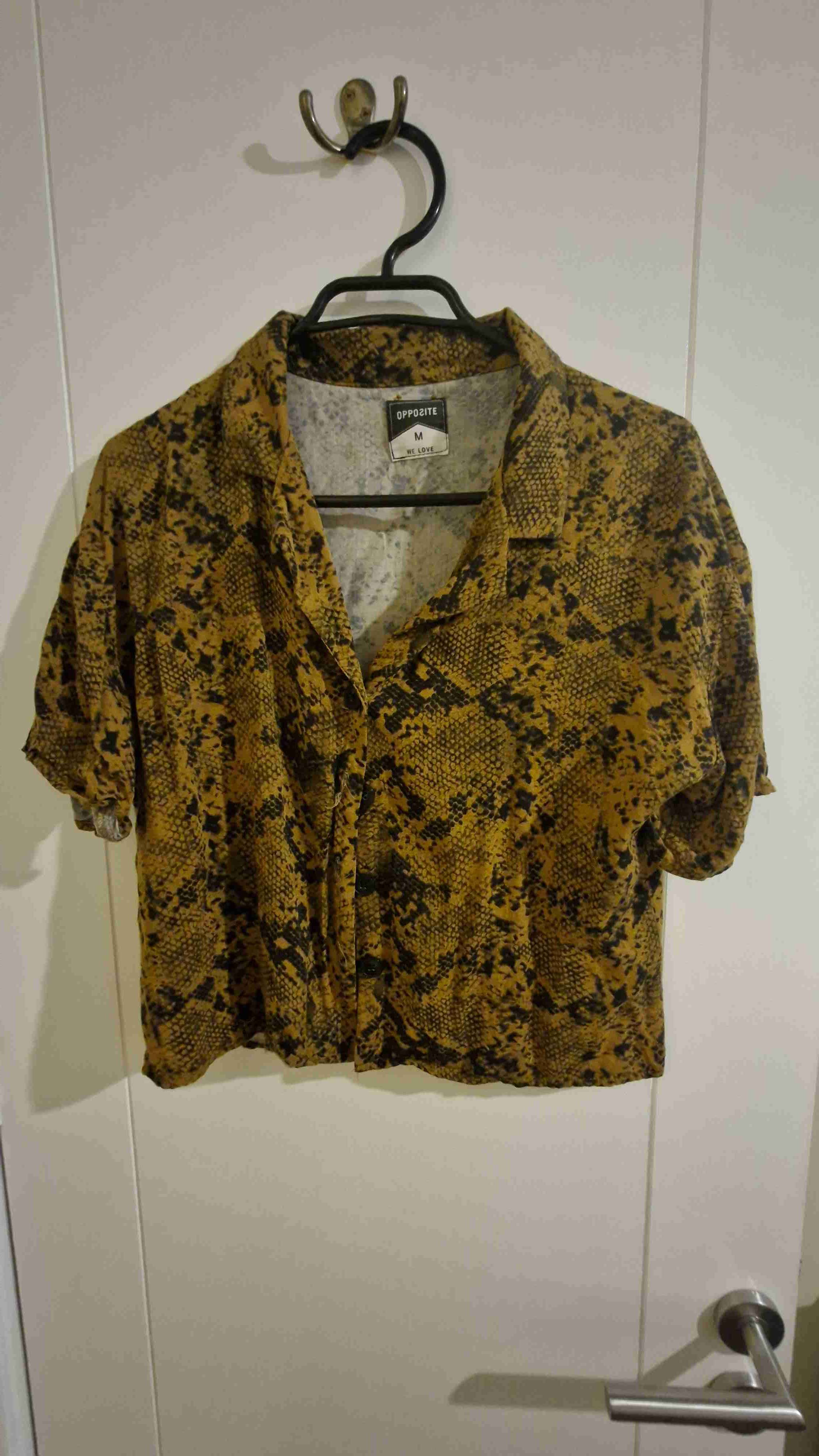 Camisa corta de mujer con estampado tipo serpiente en tonos amarillos y negros. Ideal para salidas casuales. Está en buen estado.