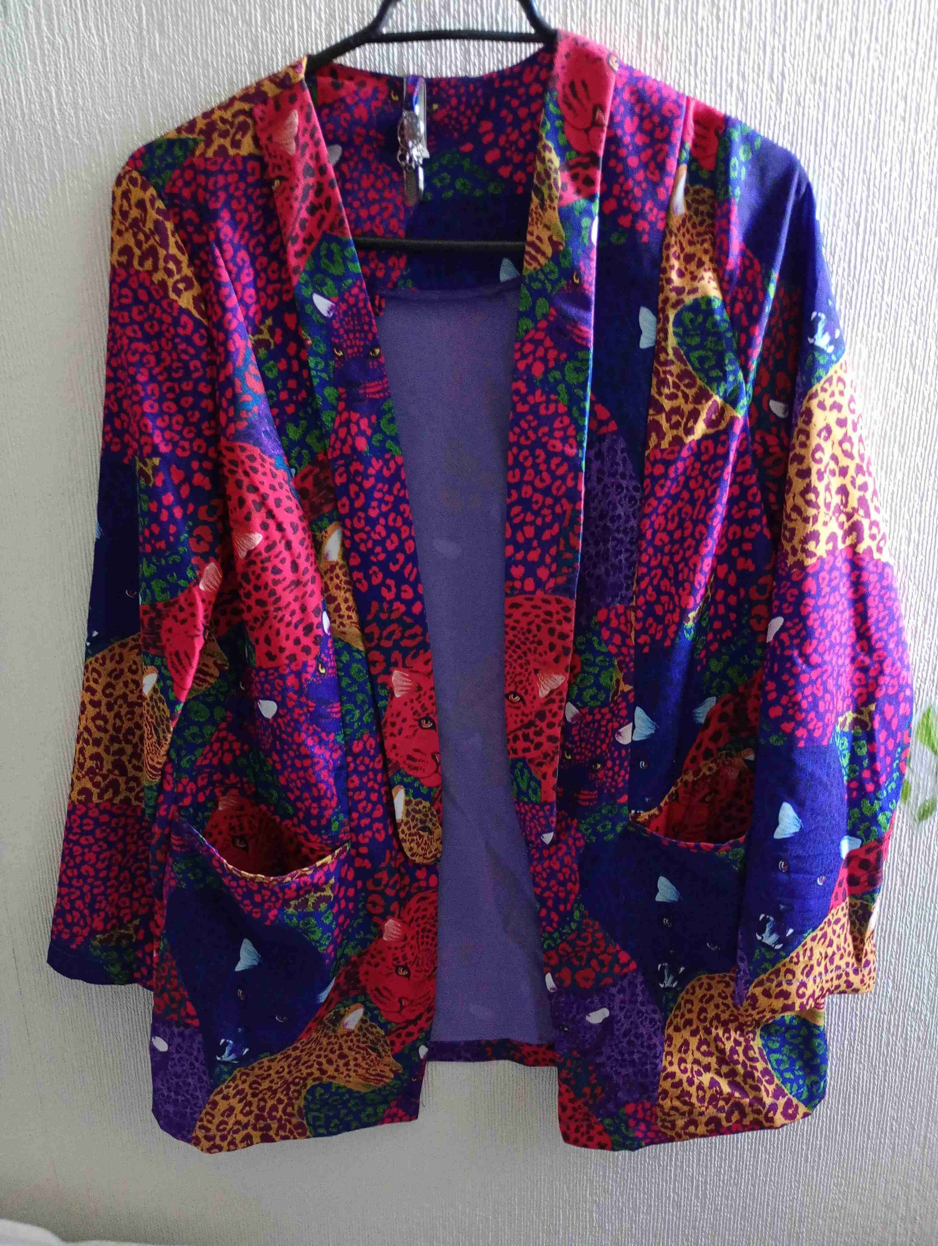 Cárdigan vibrante con estampado animal. Perfecto para dar un toque único a tu look. Buen estado general con ligeros signos de uso.