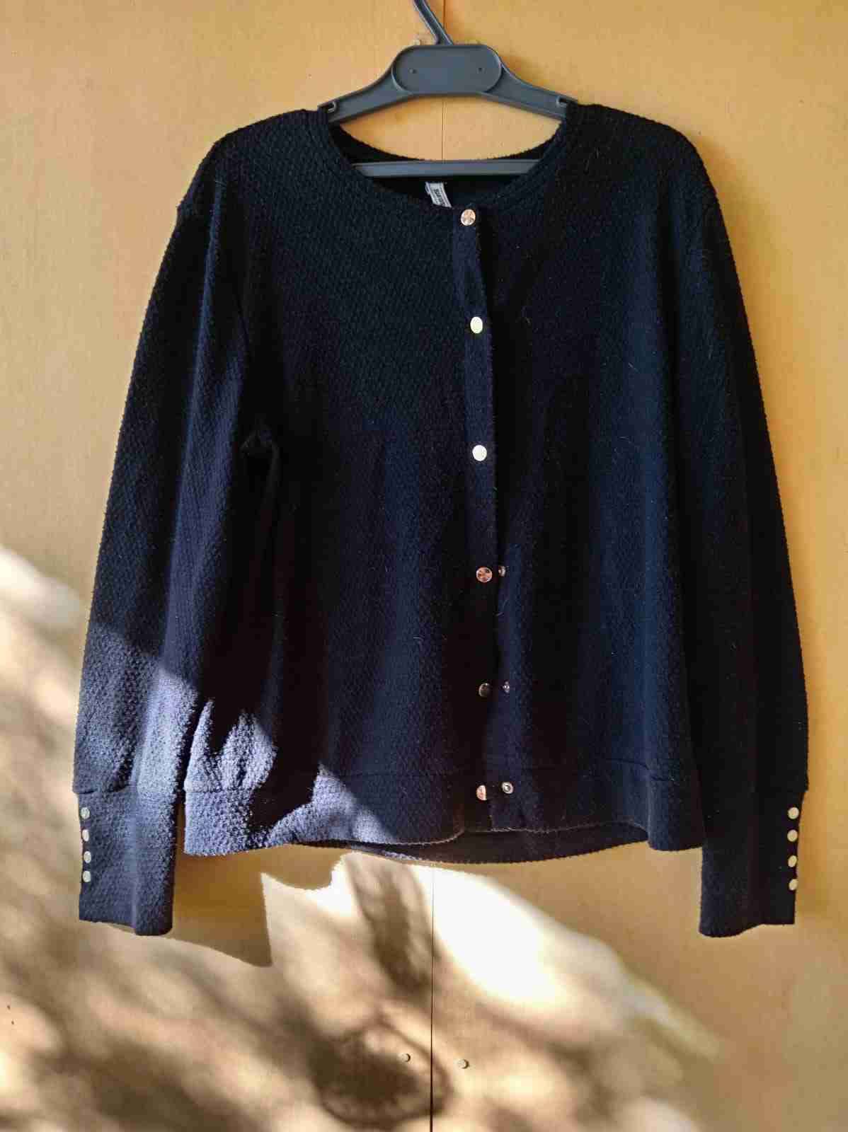 Chaleco negro de punto con botones plateados. Perfecto para usar en capa. En buen estado, con leves signos de uso.
