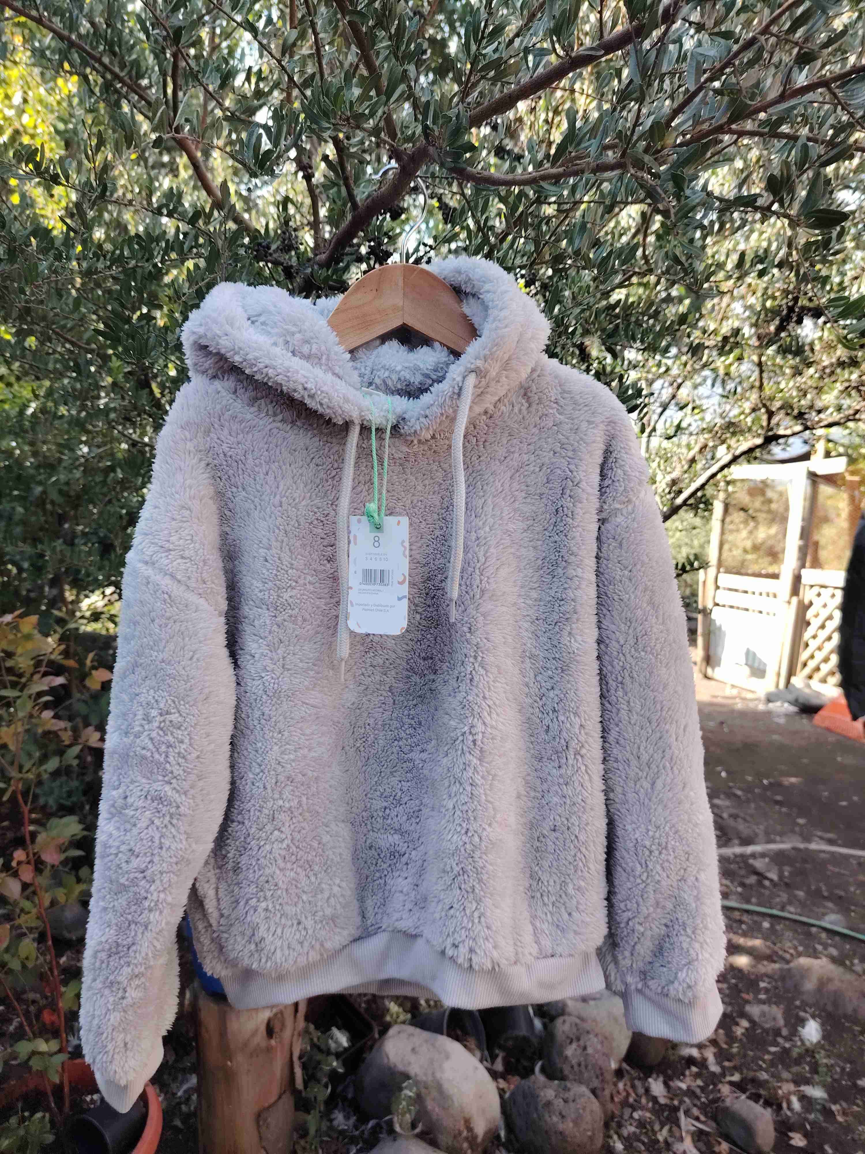 Polerón peludo y cálido en color gris claro. Perfecto para días fríos. Estado impecable, nuevo con etiqueta Talla 8