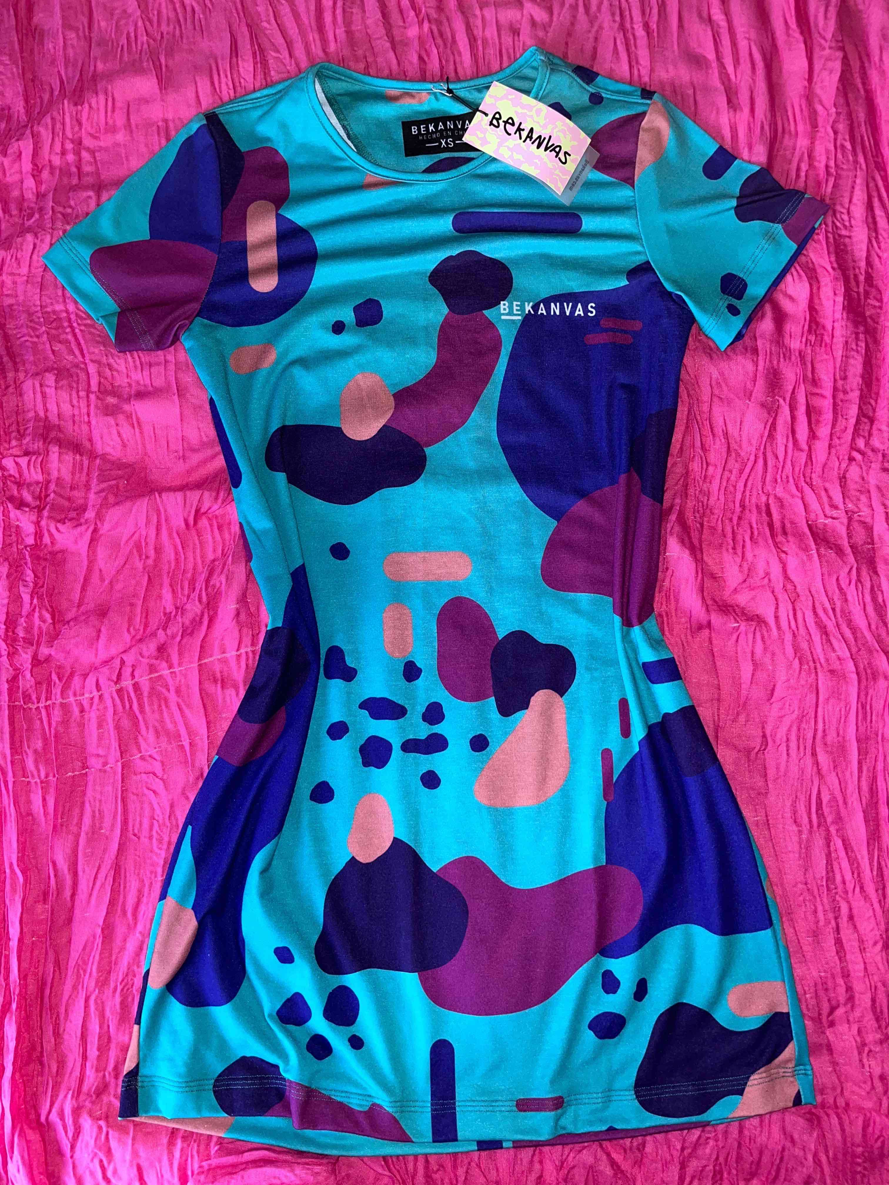 Vestido corto con diseño abstracto en tonos vibrantes, perfecto para un look casual y moderno. Nuevo con etiqueta.
