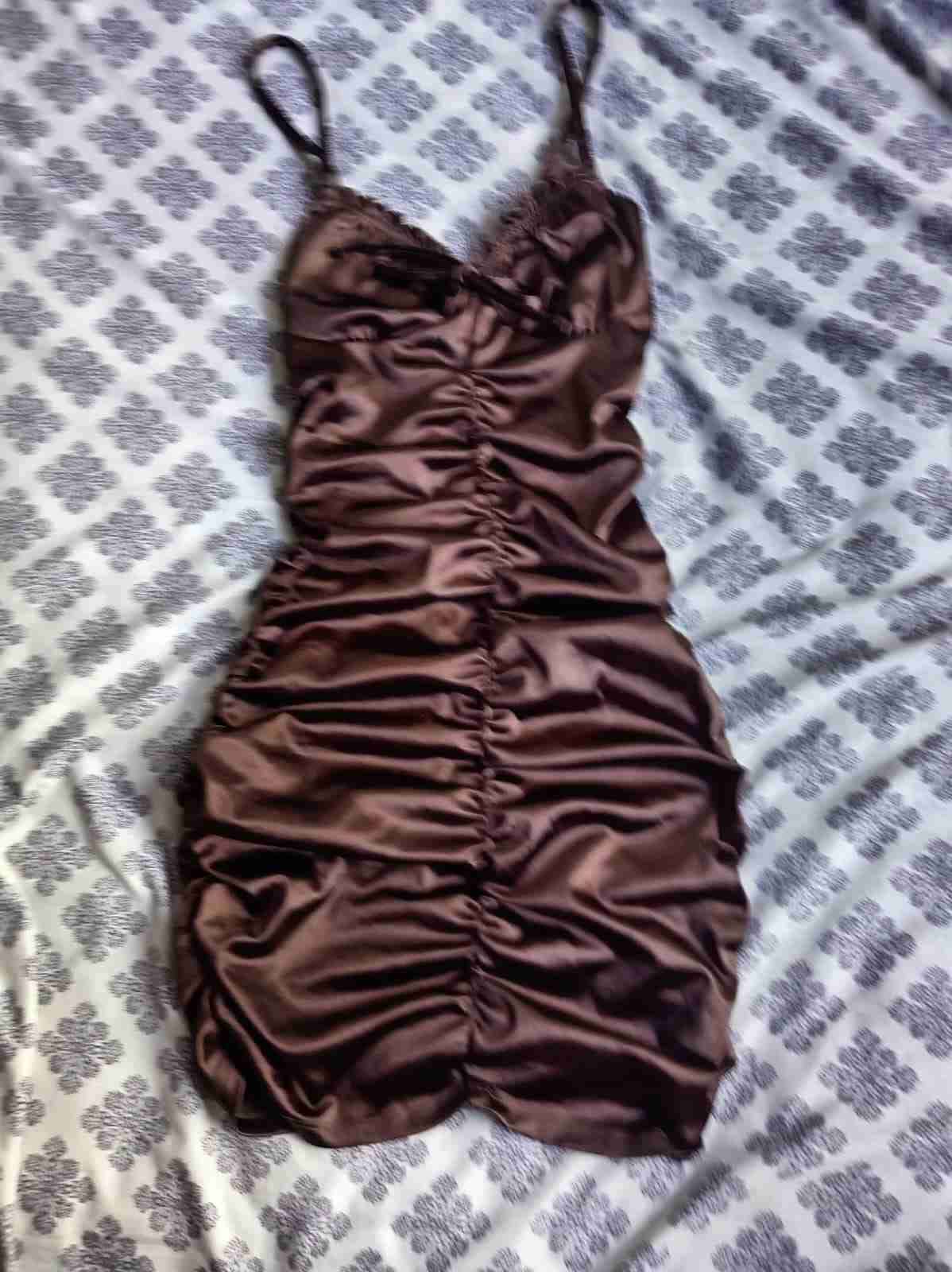Vestido corto de satén marrón, fruncido y con tirantes finos. Ideal para eventos nocturnos, en buen estado. Talla xs-s