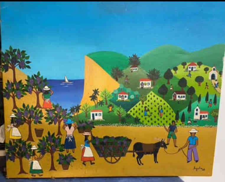 Cuadro vibrante que muestra un paisaje rural con figuras trabajando en el campo. Ideal para decorar cualquier espacio.