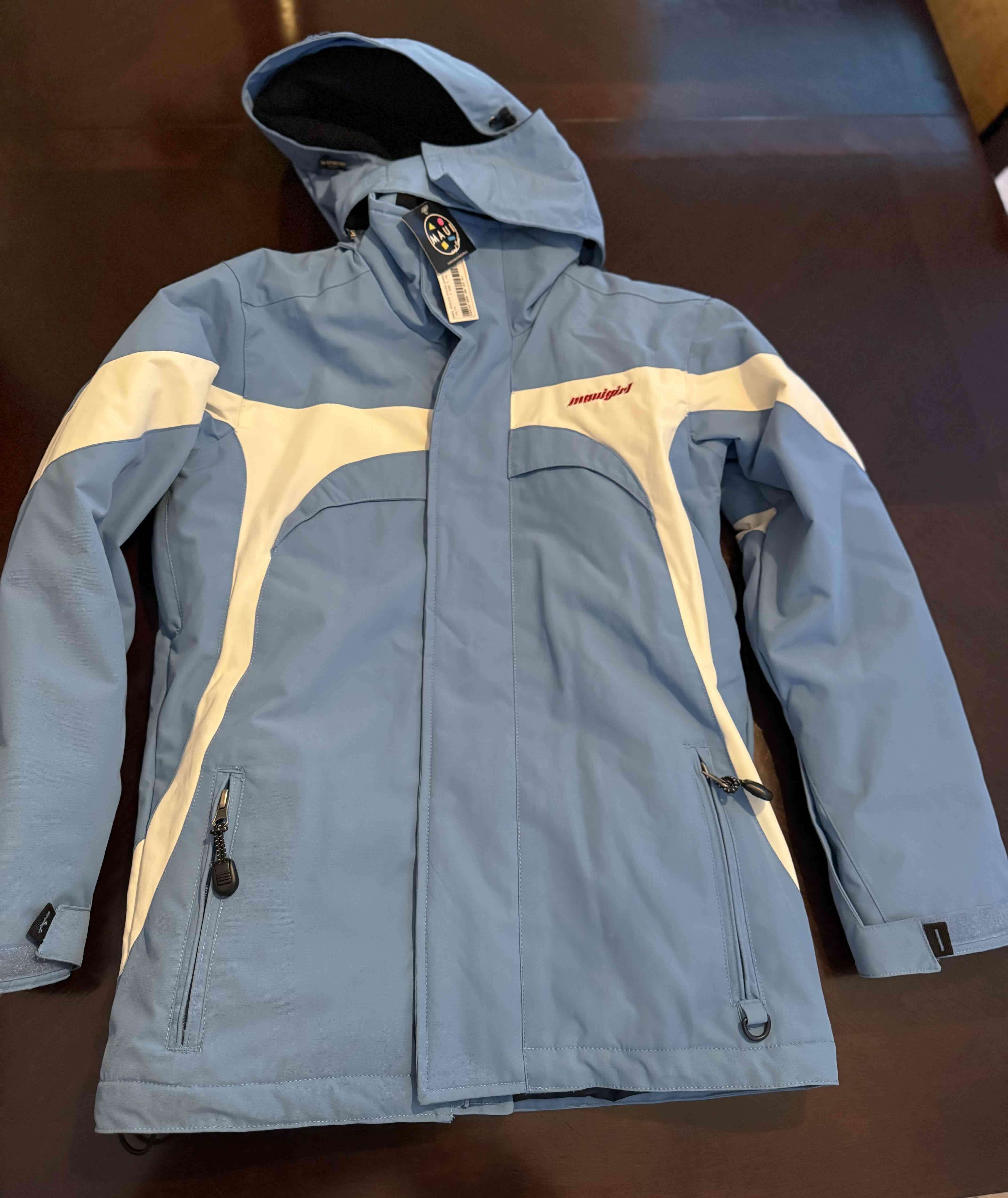 Chaqueta de invierno azul con capucha, ideal para la nieve y actividades al aire libre. Nueva con etiqueta.